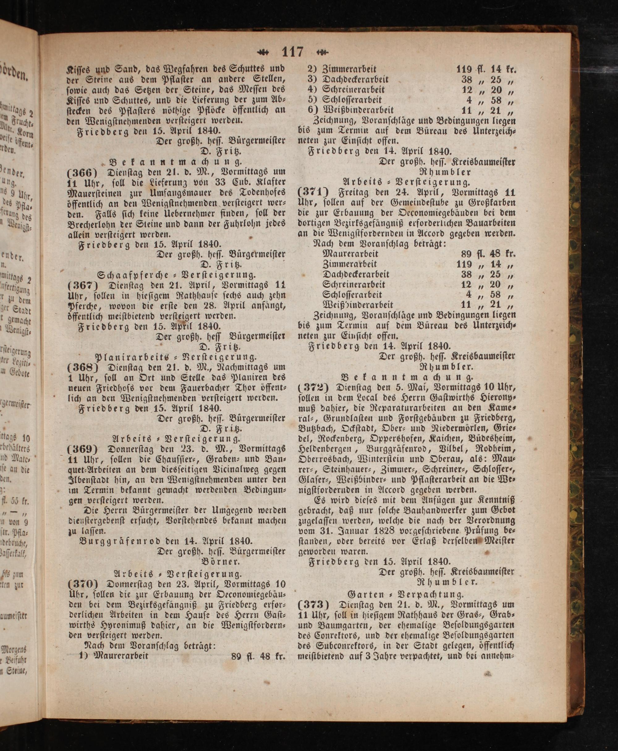 Kiſſes und Sand, das Wegfahren des Schuttes und der Steine aus dem Pflaſter an andere Stellen, ſowie auch das Setzen der Steine, das Meſſen des Kiſſes und Schuttes, und die Lieferung der zum Ab⸗ ſtecken des Pflaſters nöthige Pflöcke öffentlich an den Wenigſtnehmenden verſteigert werdeu. Friedberg den 15. April 1840. Der großh. heſſ. Bürgermeiſter D. Fritz. Bekanntmachung. (366) Dienſtag den 21. d. M., Vormittags um 11 Uhr, ſoll die Lieferung von 33 Cub. Klafter Mauerſteinen zur Umfangsmauer des Todenhofes öffentlich an den Wenigſtnehmenden verſteigert wer⸗ den. Falls ſich keine Uebernehmer finden, ſoll der Brecherlohn der Steine und dann der Fuͤhrlohn jedes allein verſteigert werden. Friedberg den 15. April 1840. Der großh. heſſ. Buͤrgermeiſter D. Fritz. Schaafpferche-Verſteigerung. (367) Dienſtag den 21. April, Vormittags 11 Uhr, ſollen in hieſigem Rathhauſe ſechs auch zehn Pferche, wovon die erſte den 28. April anfängt, oͤffentlich meiſtbietend verſteigert werden. Friedberg den 15. Apkil 1840. Der großh. heſſ Buͤrgermeiſter 5 D. Fritz, Planirarbeits⸗PVerſteigerung. (368) Dienſtag den 21. d. M., Nachmittags um 1 Uhr, ſoll an Ort und Stelle das Planiren des neuen Friedhofs vor dem Fauerbacher Thor öffent⸗ lich an den Wenigſtnehmenden verſteigert werden. Friedberg den 15. April 1840. Der großh. heſſ. Buͤrgermeiſter D. Fritz. Arbeits⸗-Verſteigerung. (369) Donnerſtag den 23. d. M., Vormittags