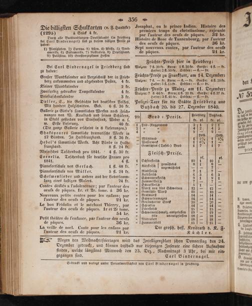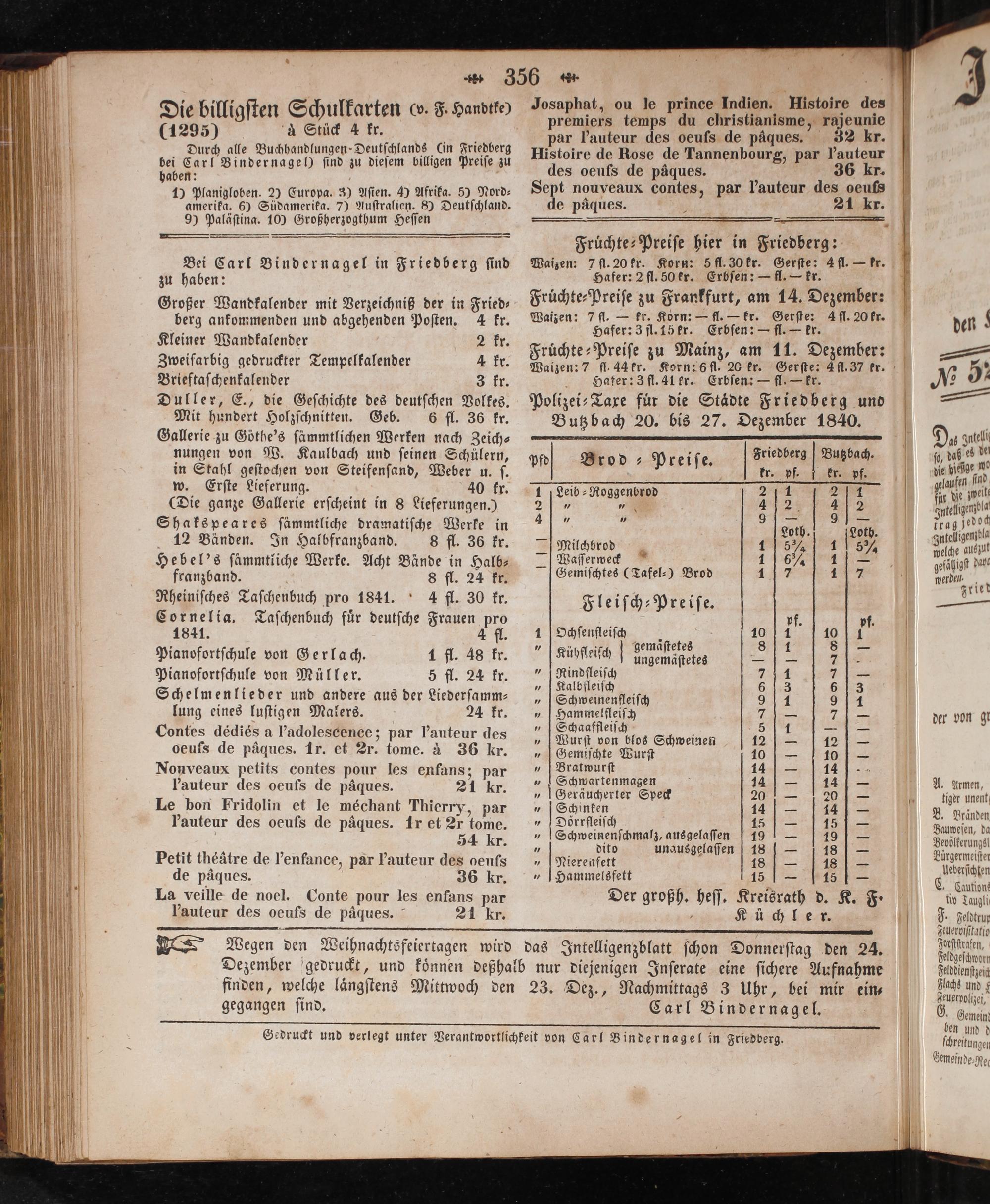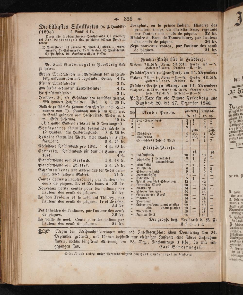 Hater: 3 fl. 41 r. Erbſen:— fl.— kr. Polizei-Taxe fuͤr die Staͤdte Friedberg und Butzbach 20. bis 27. Dezember 1840.