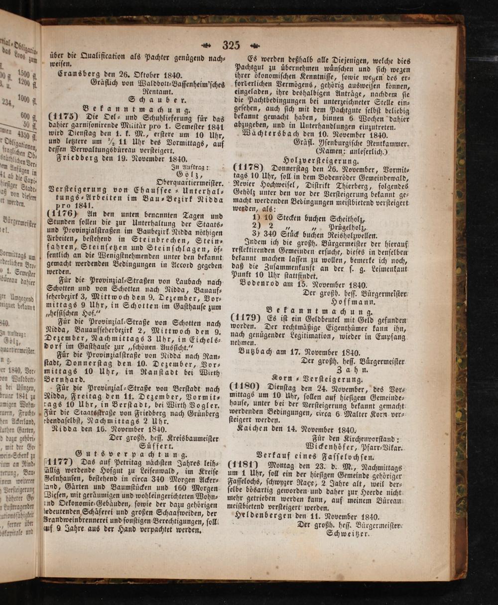 Korn ⸗Verſteigerung. (1180) Dienſtag den 24. November, des Vor⸗ mittags um 10 uhr, ſollen auf hieſigem Gemeinde- hauſe, unter bei der Verſteigerung bekannt gemacht werdenden Bedingungen, circa 6 Malter Korn ver⸗ ſteigert werden. Kaichen den 14. November 1840. Für den Kirchenvorſtand: Wickenhöfer, Pfarr⸗Vikar. Verkauf eines Faſſelochſen. (1181) Montag den 23. d. M., Nachmittags um 1 Uhr, ſoll ein der hieſigen Gemeinde gehöriger Faſſelochs, ſchwyzer Race, 2 Jahre alt, weil der⸗ ſelbe bösartig geworden und daher zur Heerde nicht mehr getrieben werden kann, auf meinem Bureau meiſtbietend verſteigert werden. Heldenbergen den 11. November 1840. Der großh. heſſ. Bürgermeiſter⸗ Schweitzer.