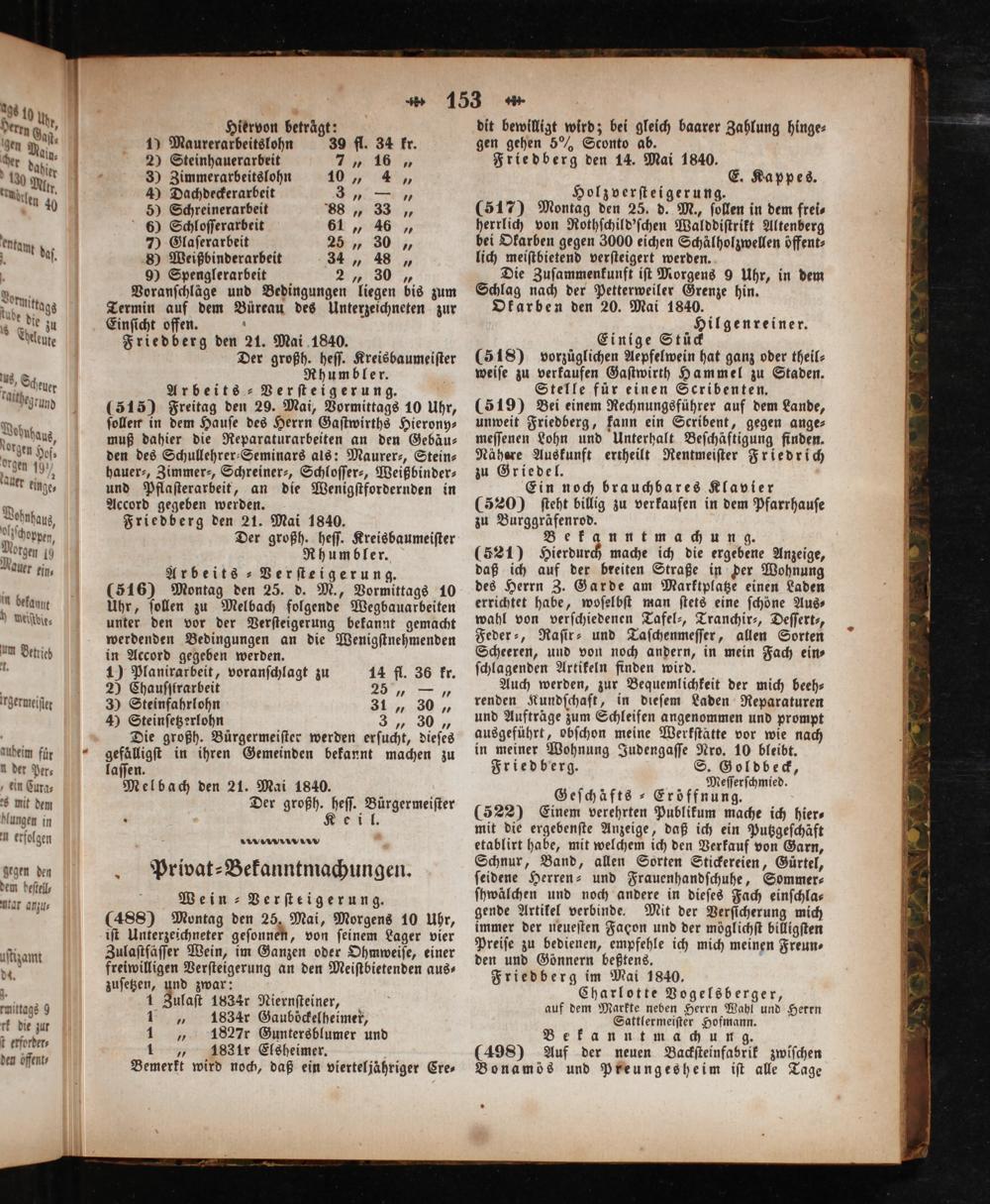 Schlag nach der Petterweiler Grenze hin. Okarben den 20. Mai 1840. Hilgenreiner. Einige Stück (518) vorzüglichen Aepfelwein hat ganz oder theil⸗ weiſe zu verkaufen Gaſtwirth Hammel zu Staden. Stelle für einen Scribenten. (519) Bei einem Rechnungsführer auf dem Lande, unweit Friedberg, kann ein Scribent, gegen ange⸗ meſſenen Lohn und Unterhalt Beſchäftigung finden. Nähere Auskunft ertheilt Rentmeiſter Friedrich zu Griedel.