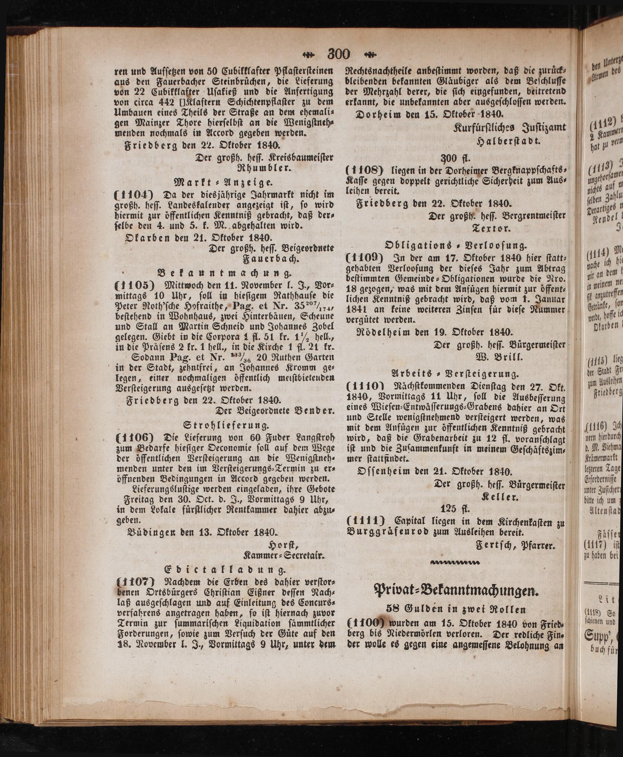 (1 100) wurden am 15. Oktober 1840 von Fried, berg bis Niedermörlen verloren. Der redliche Fin. der wolle es gegen eine angemeſſene Belohnung an