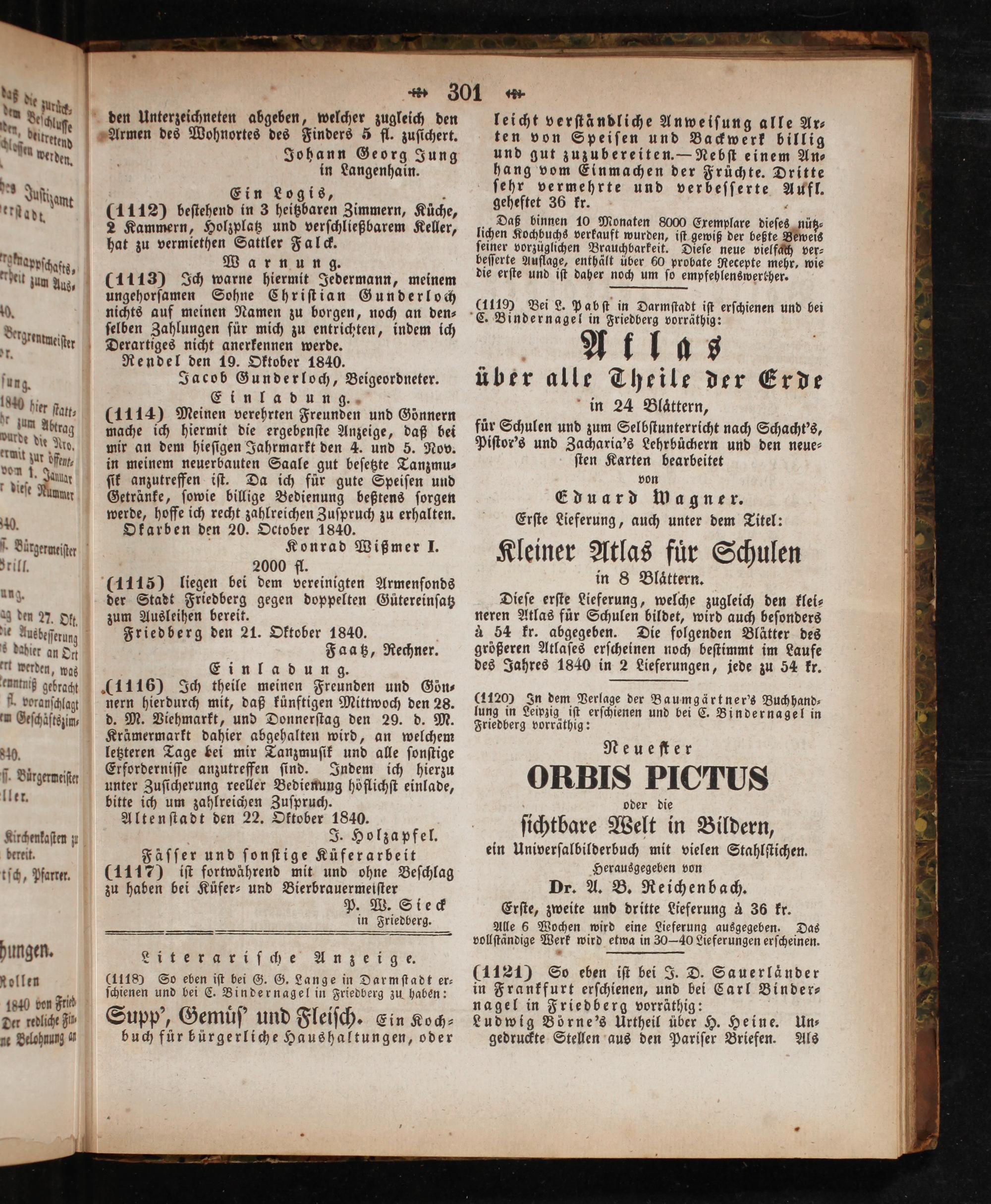 Ein Logis, a (1112) beſtehend in 3 heitzbaren Zimmern, Küche, 2 Kammern, Holzplatz und verſchließbarem Keller, hat zu vermiethen Sattler Falck. Warnung. (1113) Ich warne hiermit Jedermann, meinem ungehorſamen Sohne Chriſtian Gunderloch nichts auf meinen Namen zu borgen, noch an den⸗ ſelben Zahlungen für mich zu entrichten, indem ich Derartiges nicht anerkennen werde. Rendel den 19. Oktober 1840. Jacob Gunderloch, Beigeordneter. Einladung. (1114) Meinen verehrten Freunden und Gönnern mache ich hiermit die ergebenſte Anzeige, daß bei mir an dem hieſigen Jahrmarkt den 4. und 5. Nov. in meinem neuerbauten Saale gut beſetzte Tanzmu⸗ ſik anzutreffen iſt. Da ich für gute Speiſen und Getränke, ſowie billige Bedienung beßtens ſorgen werde, hoffe ich recht zahlreichen Zuſpruch zu erhalten. Okarben den 20. October 1840. Konrad Wißmer J. 2000 fl. (1115) liegen bei dem vereinigten Armenfonds der Stadt Friedberg gegen doppelten Gütereinſatz zum Ausleihen bereit. Friedberg den 21. Oktober 1840. Faatz, Rechner. Einladung.