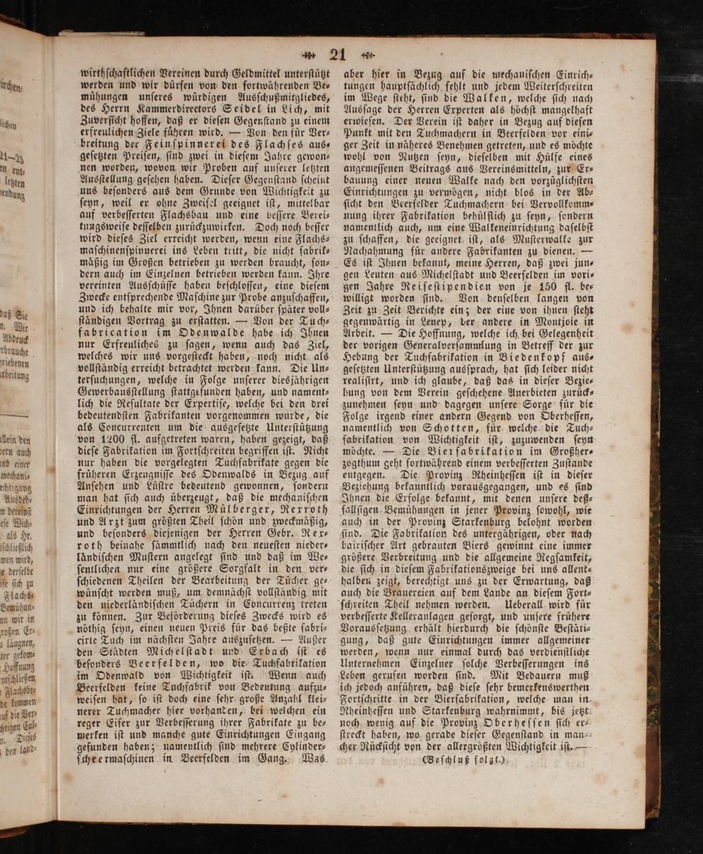 aber hier in Bezug auf die mechaniſchen Einrich— tungen hauptſächlich fehlt und jedem Weiterſchreiten im Wege ſteht, ſind die Walken, welche ſich nach Ausſage der Herren Experten als höchſt mangelhaft erwieſen. Der Verein iſt daher in Bezug auf dieſen Punkt mit den Tuchmachern in Beerfelden vor eini⸗ ger Zeit in näheres Benehmen getreten, und es möchte wohl von Nutzen ſeyn, dieſelben mit Hülfe eines angemeſſenen Beitrags aus Vereinsmitteln, zur Er- bauung einer neuen Walke nach den vorzüglichſten Einrichtungen zu vermögen, nicht blos in der Ab— ſicht den Beerfelder Tuchmachern bei Vervollkomm— nung ihrer Fabrikation behülflich zu ſeyn, ſondern namentlich auch, um eine Walkeneinrichtung daſelbſt zu ſchaffen, die geeignet iſt, als Muſterwalke zur Nachahmung für andere Fabrikanten zu dienen.— Es iſt Ihnen bekannt, meine Herren, daß zwei jun⸗ gen Leuten aus Michelſtadt und Beerfelden im vori— gen Jahre Reiſeſtipendien von je 150 fl. be⸗ willigt worden ſind. Von denſelben langen von Zeit zu Zeit Berichte ein; der eine von ihnen ſteht gegenwärtig in Lenep, der andere in Montjoie in Arbeit.— Die Hoffnung, welche ich bei Gelegenheit der vorigen Generalverſammlung in Betreff der zur Hebung der Tuchfabrikation in Biedenkopf aus— geſetzten Unterſtützung ausſprach, hat ſich leider nicht realiſirt, und ich glaube, daß das in dieſer Bezie— hung von dem Verein geſchehene Anerbieten zurück- zunehmen ſeyn und dagegen unſere Sorge für die Folge irgend einer andern Gegend von Oberheſſen, namentlich von Schotten, für welche die Tuch— fabrikation von Wichtigkeit iſt, zuzuwenden ſeyn möchte.— Die Bier fabrikation im Großher⸗ zogthum geht fortwährend einem verbeſſerten Zuſtande entgegen. Die Provinz Rheinheſſen iſt in dieſer Beziehung bekanntlich vorausgegangen, und es ſind Ihnen die Erfolge bekannt, mit denen unſere deß— fallſigen Bemühungen in jener Provinz ſowohl, wie auch in der Provinz Starkenburg belohnt worden ſind. Die Fabrikation des untergährigen, oder nach bairiſcher Art gebrauten Biers gewinnt eine immer größere Verbreitung und die allgemeine Regſamkeit, die ſich in dieſem Fabrikationszweige bei uns allent— halben zeigt, berechtigt uns zu der Erwartung, daß auch die Brauereien auf dem Lande an dieſem Fort— ſchreiten Theil nehmen werden. Ueberall wird für verbeſſerte Kelleranlagen geſorgt, und unſere frühere Vorausſetzung erhält hierdurch die ſchönſte Beſtäti— gung, daß gute Einrichtungen immer allgemeiner werden, wenn nur einmal durch das verdienſtliche Unternehmen Einzelner ſolche Verbeſſerungen ins Leben gerufen worden ſind. Mit Bedauern muß ich jedoch anführen, daß dieſe ſehr bemerkenswerthen Fortſchritte in der Bierfabrikation, welche man in Rheinheſſen und Starkenburg wahrnimmt, bis jetzt noch wenig auf die Provinz Oberheſſen ſich er— ſtreckt haben, wo gerade dieſer Gegenſtand in man