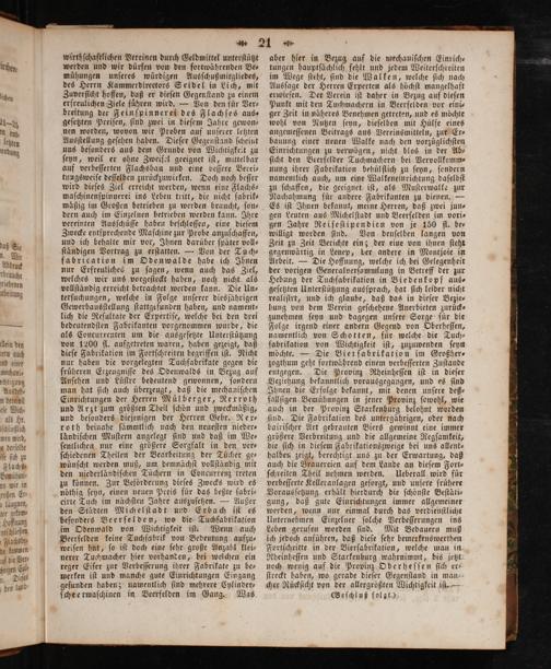 wirthſchaftlichen Vereinen durch Geldmittel unterſtüͤtzt werden und wir duͤrfen von den fortwährenden Be⸗ mühungen unſeres würdigen Ausſchußmitgliedes, des Herrn Kammerdirectors Seidel in Lich, mit Zuverſicht hoffen, daß er dieſen Gegenſtand zu einem erfreulichen Ziele fuͤhren wird.— Von den für Ver— breitung der Feinſpinnerei des Flachſes aus— geſetzten Preiſen, ſind zwei in dieſem Jahre gewon— nen worden, wovon wir Proben auf unſerer letzten Ausſtellung geſehen haben. Dieſer Gegenſtand ſcheint uns beſonders aus dem Grunde von Wichtigkeit zu ſeyn, weil er ohne Zweifel geeignet iſt, mittelbar auf verbeſſerten Flachsbau und eine beſſere Berei— tungsweiſe deſſelben zuruͤckzuwirken. Doch noch beſſer wird dieſes Ziel erreicht werden, wenn eine Flachs— maſchinenſpinnerei ins Leben tritt, die nicht fabrik— mäßig im Großen betrieben zu werden braucht, ſon— dern auch im Einzelnen betrieben werden kann. Ihre vereinten Ausſchuͤſſe haben beſchloſſen, eine dieſem Zwecke entſprechende Maſchine zur Probe anzuſchaffen, und ich behalte mir vor, Ihnen darüber ſpäter voll— ſtändigen Vortrag zu erſtatten.— Von der Tuch⸗ fabrication im Odenwalde habe ich Ihnen nur Erfreuliches zu ſagen, wenn auch das Ziel, welches wir uns vorgeſteckt haben, noch nicht als vollſtändig erreicht betrachtet werden kann. Die Un— terſuchungen, welche in Folge unſerer diesjährigen Gewerbausſtellung ſtattgefunden haben, und nament⸗ lich die Reſultate der Expertiſe, welche bei den drei bedeutendſten Fabrikanten vorgenommen wurde, die als Concurrenten um die ausgeſetzte Unterſtützung von 1200 fl. aufgetreten waren, haben gezeigt, daß dieſe Fabrikation im Fortſchreiten begriffen iſt. Nicht nur haben die vorgelegten Tuchfabrikate gegen die früheren Erzeugniſſe des Odenwalds in Bezug auf Anſehen und Luſtre bedeutend gewonnen, ſondern man hat ſich auch überzeugt, daß die mechaniſchen Einrichtungen der Herren Mülberger, Rexroth und Arzt zum größten Theil ſchön und zweckmäßig, und beſonders diejenigen der Herren Gebr. Rex— roth beinahe ſämmtlich nach den neueſten nieder— ländiſchen Muſtern angelegt ſind und daß im We— ſentlichen nur eine größere Sorgfalt in den ver— ſchiedenen Theilen der Bearbeitung der Tücher ge— wünſcht werden muß, um demnächſt vollſtändig mit den niederländiſchen Tüchern in Concurrenz treten zu können. Zur Beförderung dieſes Zwecks wird es nöthig ſeyn, einen neuen Preis für das beßte ſabri— cirte Tuch im nächſten Jahre auszuſetzen.— Außer den Städten Michelſtadt und Erbach iſt es beſonders Beerfelden, wo die Tuchfabrikation im Odenwald von Wichtigkeit iſt. Wenn auch Beerfelden keine Tuchfabrik von Bedeutung aufzu⸗ weiſen hat, ſo iſt doch eine ſehr große Anzahl klei nerer Tuchmacher hier vorhanden, bei welchen ein reger Eifer zur Verbeſſerung ihrer Fabrikate zu be— merken iſt und manche gute Einrichtungen Eingang gefunden haben; namentlich ſind mehrere Cylinder— ſcheermaſchinen in Beerfelden im Gang. Was