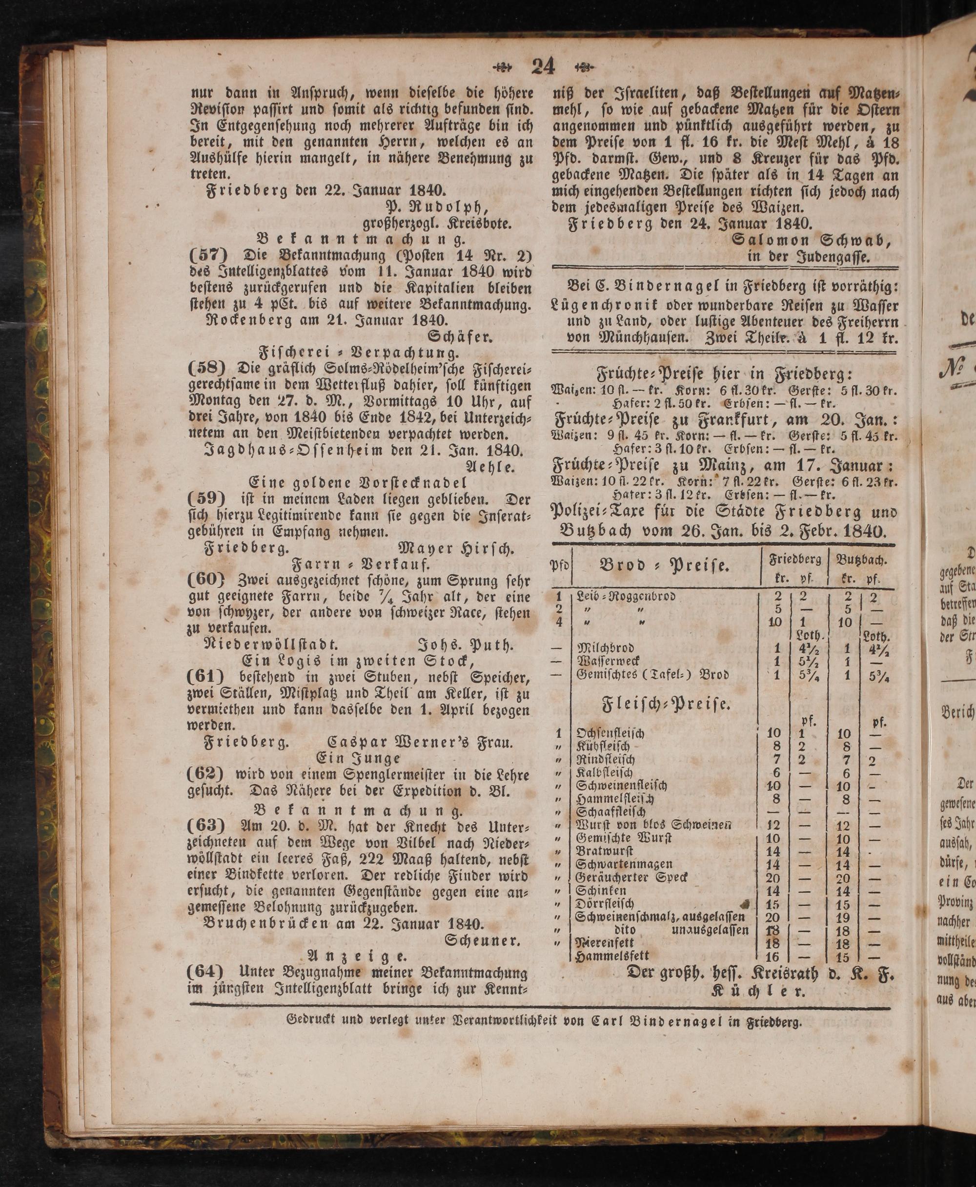 Polizei-Taxe für die Staͤdte Friedberg und Butzbach vom 26. Jan. bis 2. Febr. 1840.