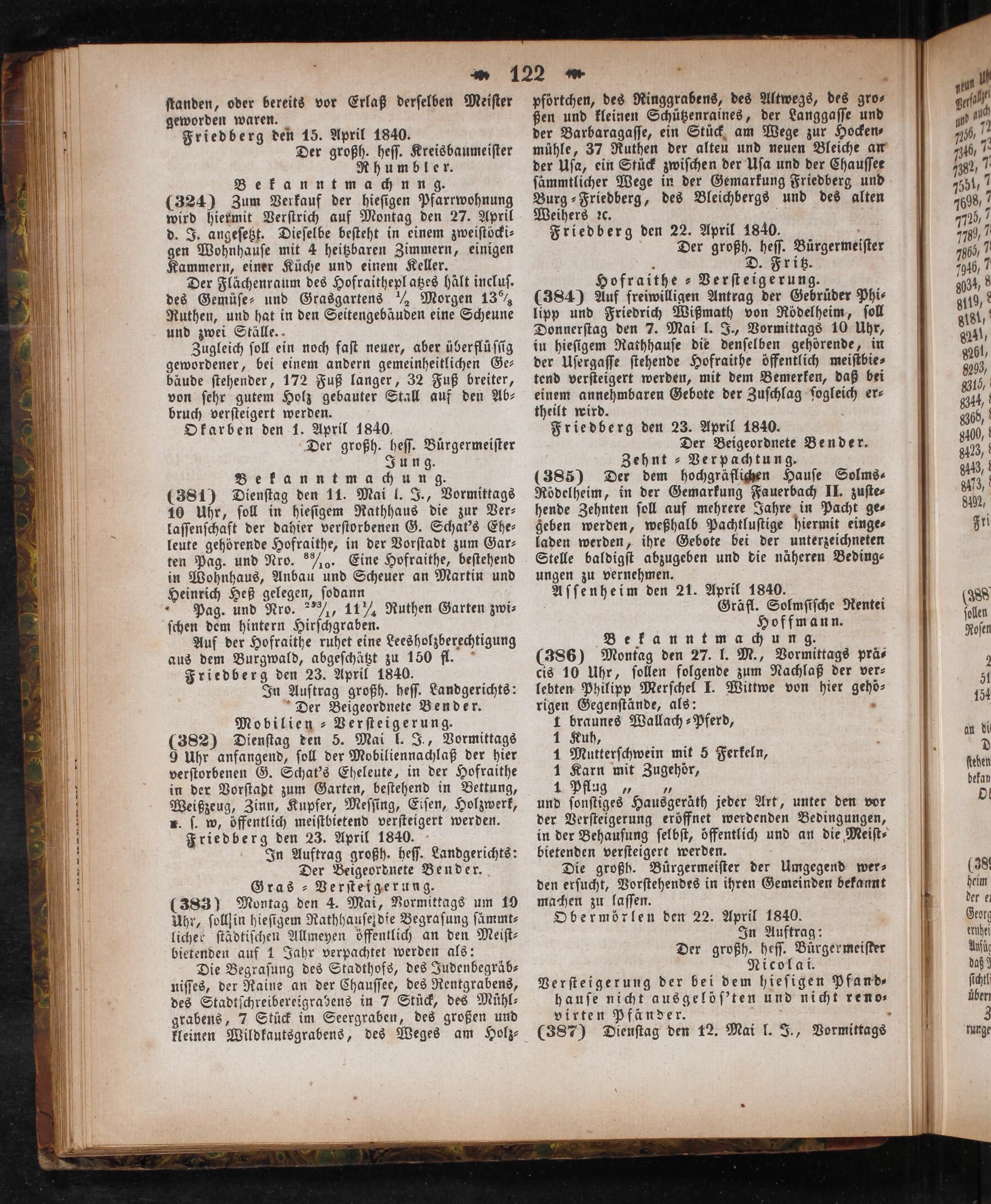 Hofraithe-Verſteigerung. (384) Auf freiwilligen Antrag der Gebrüder Phi⸗ lipp und Friedrich Wißmath von Rödelheim, ſoll Donnerſtag den 7. Mai l. J., Vormittags 10 Uhr, iu hieſigem Rathhauſe die denſelben gehörende, in der Uſergaſſe ſtehende Hofraithe öffentlich meiſtbie⸗ tend verſteigert werden, mit dem Bemerken, daß bei einem annehmbaren Gebote der Zuſchlag ſogleich er⸗ theilt wird. Friedberg den 23. April 1840. Der Beigeordnete Bender. Zehnt⸗ Verpachtung. (385) Der dem hochgräflichen Hauſe Solms⸗ Rödelheim, in der Gemarkung Fauerbach II. zuſte⸗ hende Zehnten ſoll auf mehrere Jahre in Pacht ge⸗ geben werden, weßhalb Pachtluſtige hiermit einge⸗ laden werden, ihre Gebote bei der unterzeichneten Stelle baldigſt abzugeben und die näheren Beding⸗ ungen zu vernehmen. Aſſenheim den 21. April 1840. Gräfl. Solmſiſche Rentei Hoffmann. Bekanntmachung.