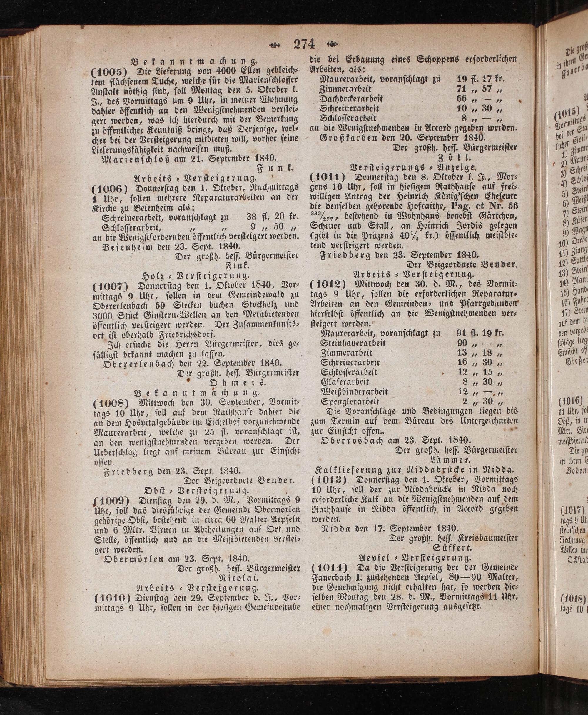 Oberrosbach am 23. Sept. 1840. Der großh. heſſ. Bürgermeiſter Lämmer. Kalklieferung zur Niddabrücke in Nidda. (1013) Donnerſtag den 1. Oktober, Vormittags 10 Uhr, ſoll der zur Niddabrücke in Nidda noch erforderliche Kalk an die Wenigſtnehmenden auf dem Rathhauſe in Nidda öffentlich in Accord gegeben werden. Nidda den 17. September 1840. Der großh. heſſ. Kreisbaumeiſter Süffert. Aepfel-Verſteigerung.
