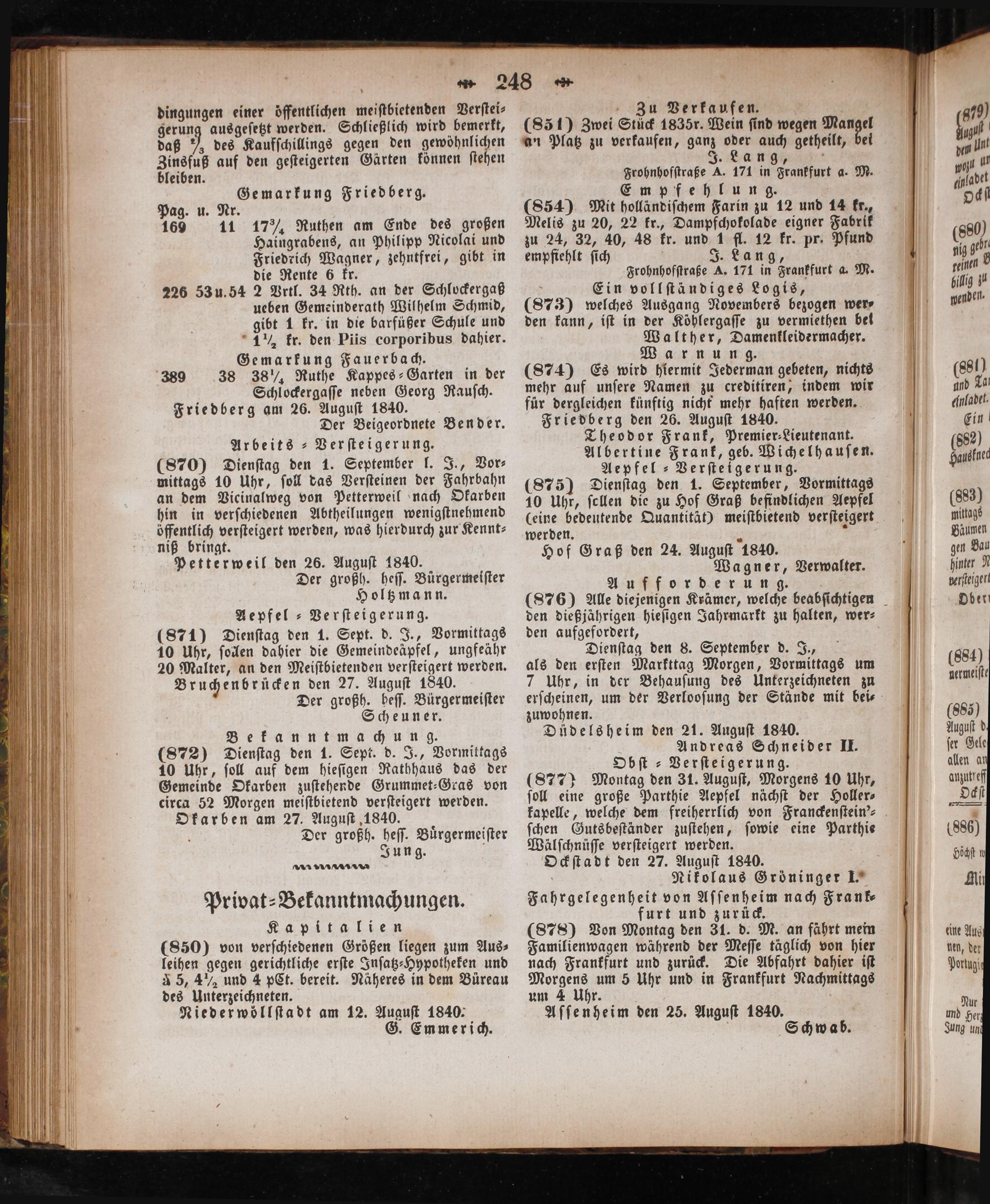 Gemarkung Fauerbach. 389 38 38 ¼ Ruthe Kappes⸗Garten in der Schlockergaſſe neben Georg Rauſch. Friedberg am 26. Auguſt 1840. Der Beigeordnete Bender. Arbeits-Verſteigerung. (870) Dienſtag den 1. September l. J., Vor⸗ mittags 10 Uhr, ſoll das Verſteinen der Fahrbahn an dem Vicinalweg von Petterweil nach Okarben hin in verſchiedenen Abtheilungen wenigſtnehmend oͤffentlich verſteigert werden, was hierdurch zur Kennt⸗ niß bringt. Petterweil den 26. Auguſt 1840. Der großh. heſſ. Buͤrgermeiſter Holtzmann. Aepfel⸗Verſteigerung. (871) Dienſtag den 1. Sept. d. J., Vormittags 10 Uhr, ſoclen dahier die Gemeindeäpfel, ungfeähr 20 Malter, an den Meiſtbietenden verſteigert werden. Bruchenbrücken den 27. Auguſt 1840. Der großh. beſſ. Bürgermeiſter Scheuner. Bekanntmachung. (872) Dienſtag den 1. Sept. d. J., Vormittags 10 Uhr, ſoll auf dem hieſigen Rathhaus das der Gemeinde Okarben zuſtehende Grummet⸗Gras von circa 52 Morgen meiſtbietend verſteigert werden. Okarben am 27. Auguſt 1840. f Der großh. heſſ. Buͤrgermeiſter Jung. a