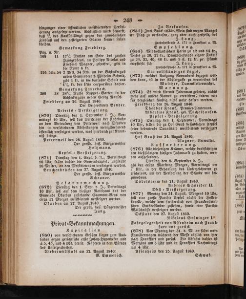 Zu Verkaufen. N 5 (851) Zwei Stück 18351. Wein ſind wegen 1 an Platz zu verkaufen, ganz oder auch getheilt, bei J. Lea nge, Frohnhofſtraße A. 171 in Frankfurt a. M. Empfehlung. (854) Mit holländiſchem Farin zu 12 und 14 kr., Melis zu 20, 22 kr., Dampfchokolade eigner Fabrik zu 24, 32, 40, 48 kr. und 1 fl. 12 kr. pr. Pfund empfiehlt ſich. Lang, Frohnhofſtraße A. 171 in Frankfurt a. M. . Ein vollſtändiges Logis, (873) welches Ausgang Novembers bezogen wer⸗ den kann, iſt in der Köhlergaſſe zu vermiethen bel Walther, Damenkleidermacher. Warnung. (874) Es wird hiermit Jederman gebeten, nichts mehr auf unſere Namen zu creditiren, indem wir für dergleichen künftig nicht mehr haften werden. Friedberg den 26. Auguſt 1840. Theodor Frank, Premier-Lieutenant. Albertine Frank, geb. Wichelhauſen. Aepfel⸗Verſteigerung. (875) Dienſtag den 1. September, Vormittags 10 Uhr, ſcllen die zu Hof Graß befindlichen Aepfel (eine bedeutende Quantität) meiſtbietend verſteigert werden. 7 Hof Graß den 24. Auguſt 1840. Wagner, Verwalter. Aufforderung.