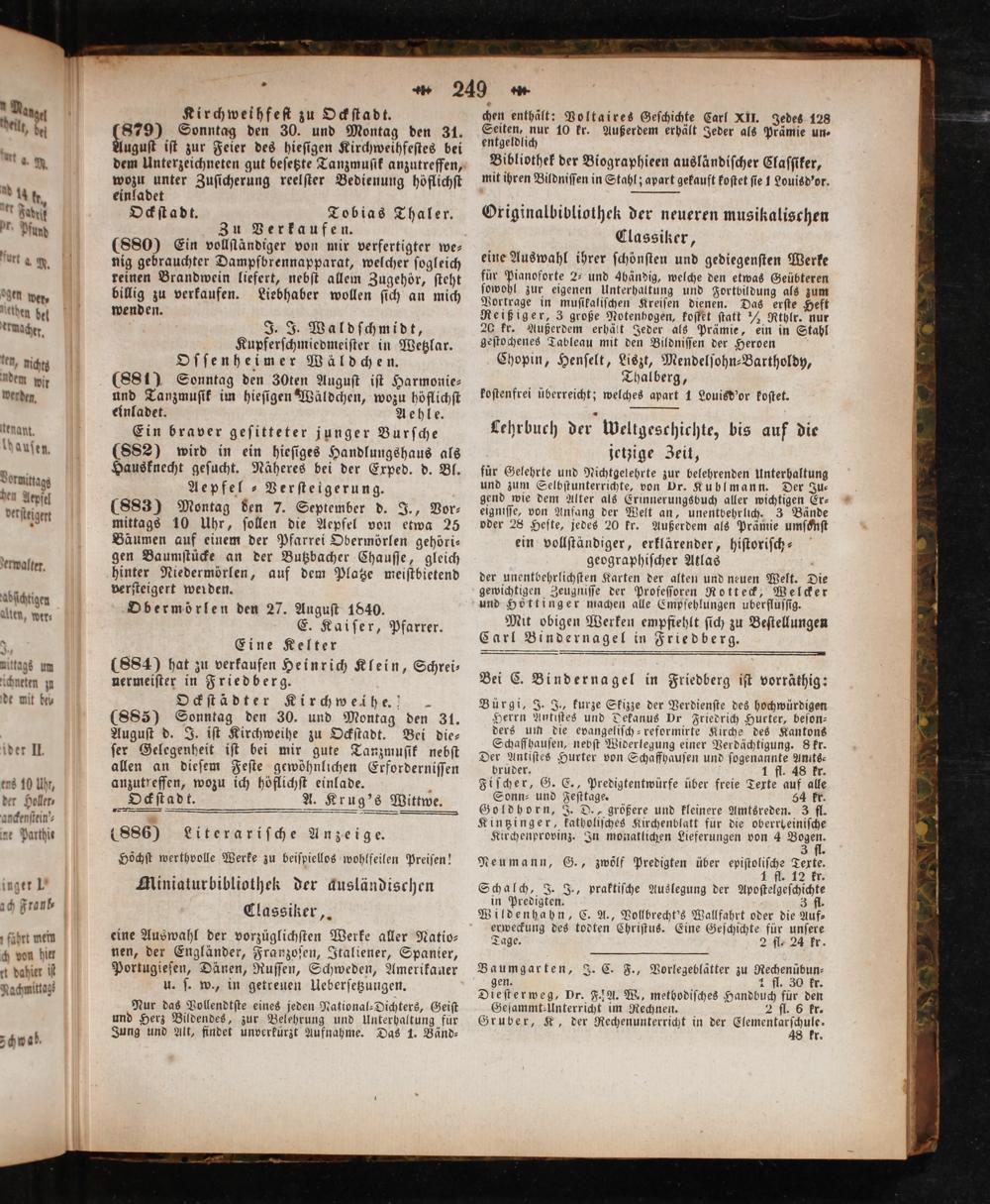 einladet Ockſtadt. Tobias Thaler. Zu Verkaufen. (880) Ein vollſtändiger von mir verfertigter we— nig gebrauchter Dampfbrennapparat, welcher ſogleich reinen Brandwein liefert, nebſt allem Zugehör, ſteht billig zu verkaufen. Liebhaber wollen ſich an mich wenden. J. J. Waldſchmidt, Kupferſchmiedmeiſter in Wetzlar. Oſſenheimer Wäldchen. (881) Sonntag den 30ten Auguſt iſt Harmonie⸗ und Tanzmuſik im hieſigen Wäldchen, wozu höflichſt einladet. Aehle. Ein braver geſitteter junger Burſche (882) wird in ein hieſiges Handlungshaus als Hausknecht geſucht. Näheres bei der Exped. d. Bl. Aepfel ⸗Verſteigerung. (883) Montag den 7. September d. J., Vor⸗ mittags 10 Uhr, ſollen die Aepfel von etwa 25 Bäumen auf einem der Pfarrei Obermörlen gehöri— gen Baumſtücke an der Butzbacher Chauſſe, gleich hinter Niedermörlen, auf dem Platze meiſtbietend verſteigert werden. Obermörlen den 27. Auguſt 1840. E. Kaiſer, Pfarrer. Eine Kelter (884) hat zu verkaufen Heinrich Klein, Schrei⸗ nermeiſter in Friedberg. Ockſtädter Kirchweihe. (885) Sonntag den 30. und Montag den 31. Auguſt d. J. iſt Kirchweihe zu Ockſtadt. Bei die⸗ ſer Gelegenheit iſt bei mir gute Tanzmuſik nebſt allen an dieſem Feſte gewöhnlichen Erforderniſſen anzutreffen, wozu ich höflichſt einlade. 5 Ockſtadt. A. Krug's Wittwe.