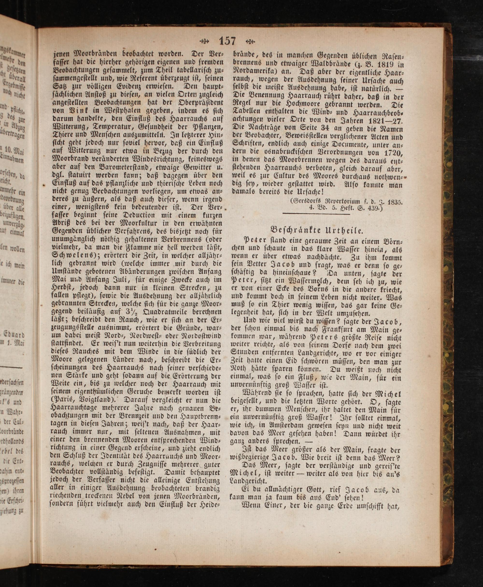 jenen Moorbränden beobachtet worden. Der Ver⸗ faſſer hat die hierher gehörigen eigenen und fremden Beobachtungen geſammelt, zum Theil tabellariſch zu— ſammengeſtellt und, wie Referent überzeugt iſt, ſeinen Satz zur völligen Evidenz erwieſen. Den haupt⸗ ſächlichen Anſtoß zu dieſen, an vielen Orten zugleich angeſtellten Beobachtungen hat der Oberpräſident von Vink in Weſtphalen gegeben, indem es ſich darum handelte, den Einfluß des Haarrauchs auf Witterung, Temperatur, Geſundheit der Pflanzen, Thiere und Menſchen auszumitteln. In letzterer Hin⸗ ſicht geht jedoch nur ſoviel hervor, daß ein Einfluß auf Witterung nur etwa in Bezug der durch den Moorbrand veränderten Windesrichtung, keineswegs aber auf den Barometerſtand, etwaige Gewitter u. dgl. ſtatuirt werden kann; daß dagegen über den Einfluß auf das pflanzliche und thieriſche Leben noch nicht genug Beobachtungen vorliegen, um etwas an— deres zu äußern, als daß auch dieſer, wenn irgend