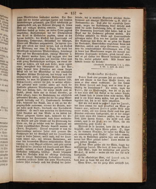 brände, des in manchen Gegenden üblichen Ra ſen⸗ brennens und etwaiger Waldbrände(z. B. 1819 in Nordamerika) an. Daß aber der eigentliche Haar⸗ rauch, wegen der Ausdehnung ſeiner Urſache auch ſelbſt die meiſte Ausdehnung habe, iſt natürlich.— Die Benennung Haarrauch rührt daher, daß in der Regel nur die Hochmoore gebrannt werden. Die Tabellen enthalten die Wind- und Haarrauchbeob⸗ achtungen vieler Orte von den Jahren 1821—27. Die Nachträge von Seite 34 an geben die Namen der Beobachter, Beweisſtellen verglichener Acten und Schriften, endlich auch einige Documente, unter an— dern die osnabruckiſchen Verordnungen von 1720, in denen das Moorbrennen wegen des daraus ent— ſtehenden Haarrauchs verboten, gleich darauf aber, weil es zur Cultur des Moores durchaus nothwen— dig ſey, wieder geſtattet wird. Alſo kannte man damals bereits die Urſache!