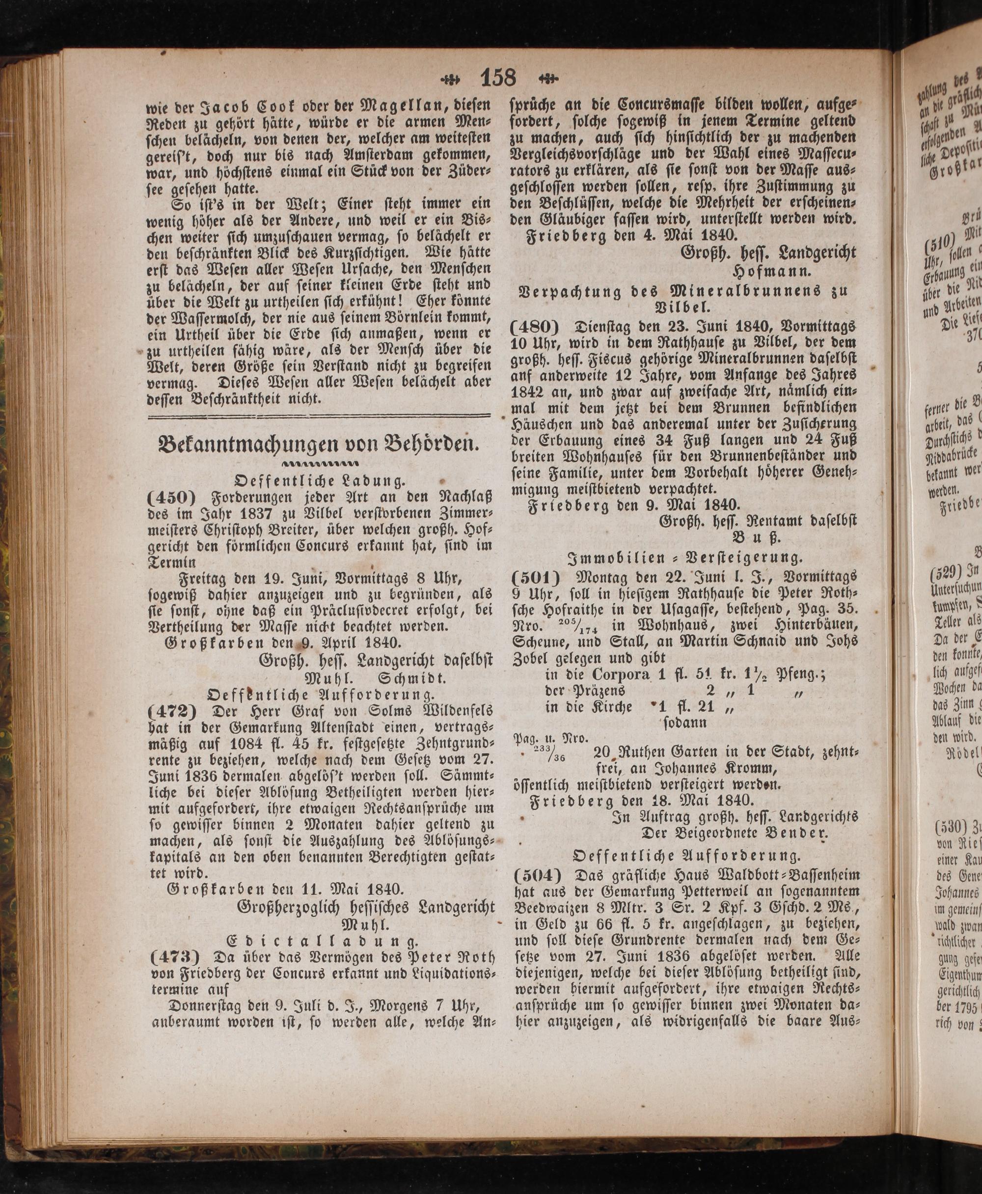 Bekanntmachungen von Behoͤrden. Oeffentliche Ladung.„ (450) Forderungen jeder Art an den Nachlaß des im Jahr 1837 zu Vilbel verſtorbenen Zimmer⸗ meiſters Chriſtoph Breiter, uͤber welchen großh. Hof⸗ gericht den förmlichen Concurs erkannt hat, ſind im