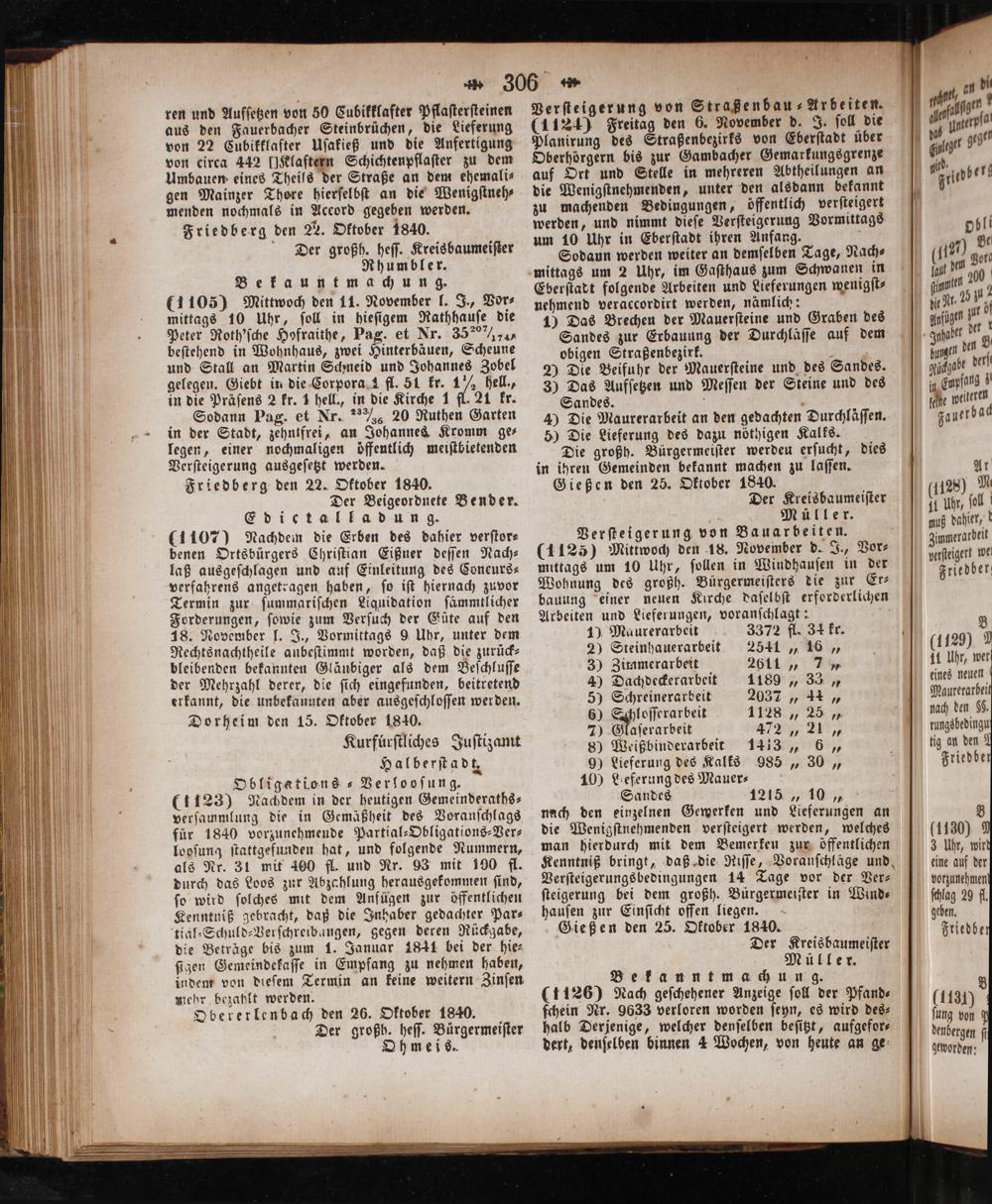 (1105) Mittwoch den 11. November l. J., Vor⸗ mittags 10 Uhr, ſoll in hieſigem Rathhauſe die Peter Roth'ſche Hofraithe, Pag. et Nr. 359 beſtehend in Wohnhaus, zwei Hinterbäuen, Scheune und Stall an Martin Schneid und Johannes Zobel gelegen. Giebt in die Corpora 1 fl. 51 kr. 1½ hell., in die Präſens 2 kr. 1 hell., in die Kirche 1 fl. 21 kr. Sodann Pag. et Nr. 6 20 Ruthen Garten in der Stadt, zehntfrei, an Johannes Kromm ge⸗ legen, einer nochmaligen öffentlich meiſtbietenden Verſteigerung ausgeſetzt werden. Friedberg den 22. Oktober 1840. Der Beigeordnete Bender. Edicetal ladung. (1107) Nachdem die Erben des dahier verſtor⸗ benen Ortsbürgers Chriſtian Eißner deſſen Nach- laß ausgeſchlagen und auf Einleitung des Coneurs⸗ verfahrens angetragen haben, ſo iſt hiernach zuvor Termin zur ſummariſchen Liquidation ſämmtlicher Forderungen, ſowie zum Verſuch der Güte auf den 18. November l. J., Vormittags 9 Uhr, unter dem Rechtsnachtheile anbeſtimmt worden, daß die zurück— bleibenden bekannten Gläubiger als dem Beſchluſſe der Mehrzahl derer, die ſich eingefunden, beitretend erkannt, die unbekannten aber ausgeſchloſſen werden. Dorheim den 15. Oktober 1840. Kurfuͤrſtliches Juſtizamt Halberſtadt, Obligations ⸗Verlooſung. (1123) Nachdem in der heutigen Gemeinderaths⸗ verſaumlung die in Gemäßheit des Voranſchlags für 1840 vorzunehmende Partial-Obligations-Ver⸗ looſung ſtattgefunden hat, und folgende Nummern, als Nr. 31 mit 400 fl. und Nr. 93 mit 100 fl. durch das Loos zur Abzahlung herausgekommen ſind, ſo wird ſolches mit dem Anfügen zur öffentlichen Kenntniß gebracht, daß die Inhaber gedachter Par⸗ tial⸗Schuld⸗Verſchreibungen, gegen deren Rückgabe, die Beträge bis zum 1. Januar 1841 bei der hie⸗ ſigen Gemeindekaſſe in Empfang zu nehmen haben, indem von dieſem Termin an keine weitern Zinſen mehr bezahlt werden. Obererlenbach den 26. Oktober 1840. Der großh. heſſ. Bürgermeiſter Ohmeis.