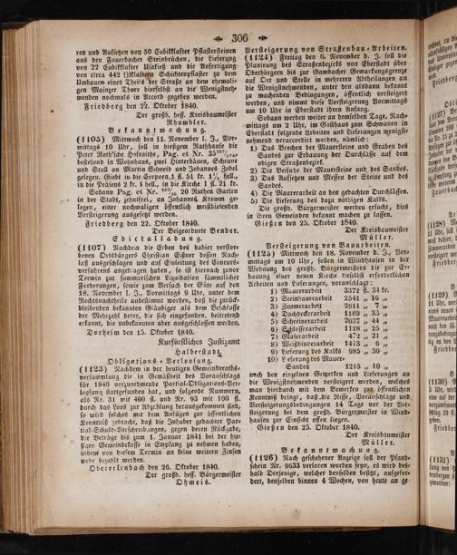 ren und Aufſetzen von 50 Cubikklafter Pflaſterſteinen aus den Fauerbacher Steinbrüchen, die Lieferung von 22 Cubikklafter Uſakieß und die Anfertigung von circa 442[IKlaftern Schichtenpflaſter zu dem Umbauen eines Theils der Straße an dem ehemali⸗ gen Mainzer Thore hierſelbſt an die Wenigſtneh⸗ menden nochmals in Aceord gegeben werden. Friedberg den N. Oktober 1840.