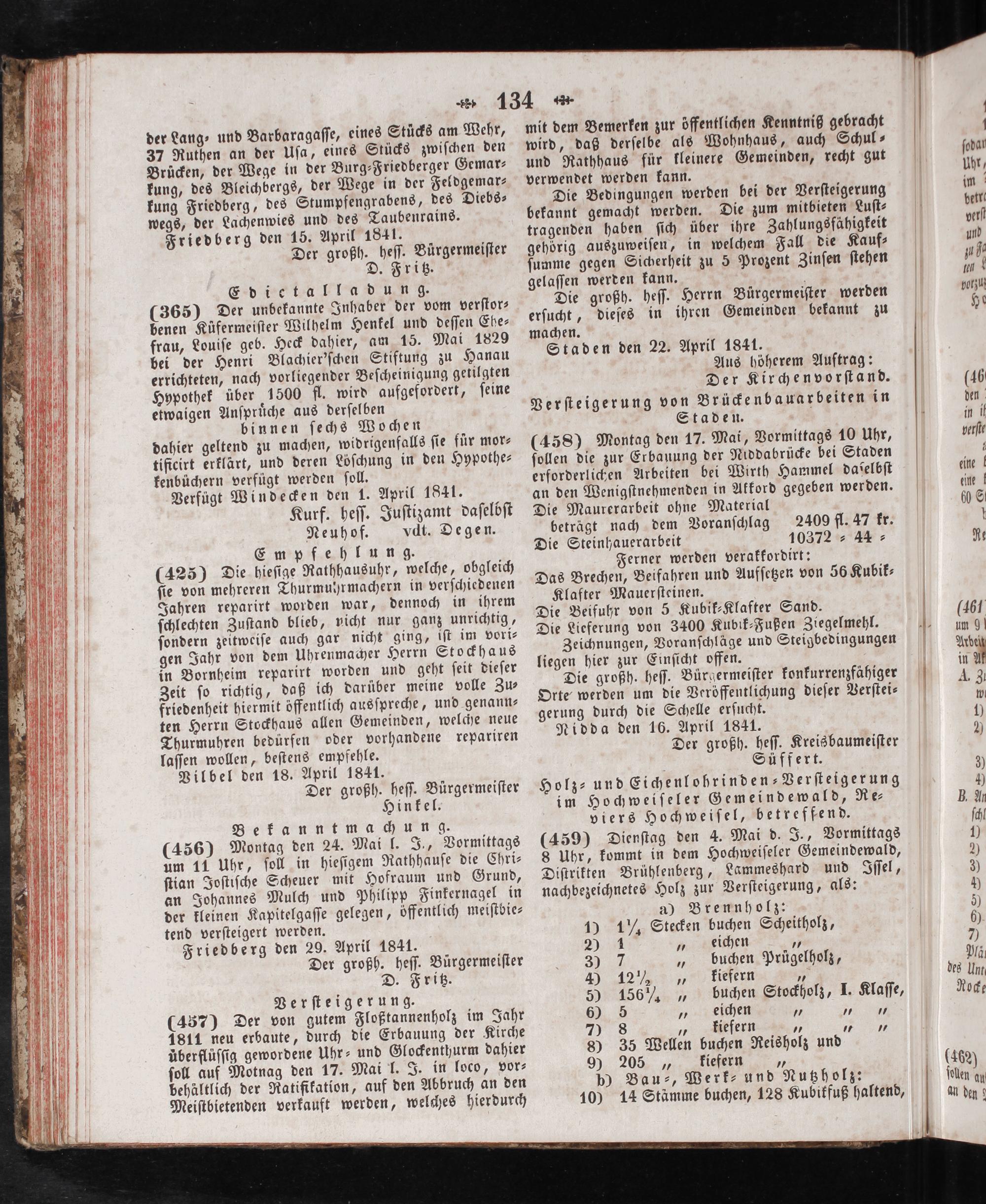 Edictal ladung. (365) Der unbekannte Inhaber der vom verſtor— benen Küfermeiſter Wilhelm Henkel und deſſen Ehe⸗ frau, Louiſe geb. Heck dahier, am 15. Mai 1829 bei der Henri Blachier'ſchen Stiftung zu Hanau errichteten, nach vorliegender Beſcheinigung getilgten Hypothek über 1500 fl. wird aufgefordert, ſeine etwaigen Anſpruͤche aus derſelben binnen ſechs Wochen dahier geltend zu machen, widrigenfalls ſie für mor⸗ tificirt erklärt, und deren Löſchung in den Hypothe⸗ kenbüchern verfügt werden ſoll. Verfügt Windecken den 1. April 1841. Kurf. heſſ. Juſtizamt daſelbſt Neuhof. dt. Degen. Empfehlung. (425) Die hieſige Rathhausuhr, welche, obgleich ſie von mehreren Thurmuhrmachern in verſchiedenen Jahren reparirt worden war, dennoch in ihrem ſchlechten Zuſtand blieb, vicht nur ganz unrichtig, ſondern zeitweiſe auch gar nicht ging, iſt im vori⸗ gen Jahr von dem Uhrenmacher Herrn Stockhaus in Bornheim reparirt worden und geht ſeit dieſer Zeit ſo richtig, daß ich darüber meine volle Zu⸗ friedenheit hiermit öffentlich ausſpreche, und genann⸗ ten Herrn Stockhaus allen Gemeinden, welche neue Thurmuhren bedürfen oder vorhandene repariren laſſen wollen, beſtens empfehle. Vilbel den 18. April 1841. Der großh. heſſ. Bürgermeiſter Hinkel. Bekanntmachung. (456) Montag den 24. Mai l. J., Vormittags um 11 Uhr, ſoll in hieſigem Rathhauſe die Chri⸗ ſtian Joſtiſche Scheuer mit Hofraum und Grund, an Johannes Mulch und Philipp Finkernagel in der kleinen Kapitelgaſſe gelegen, öffentlich meiſtbie⸗ tend verſteigert werden. Friedberg den 29. April 1841. Der großh. heſſ. Bürgermeiſter D. Fritz. Verſteigerung. (457) Der von gutem Floßtannenholz im Jahr 1811 neu erbaute, durch die Erbauung der Kirche überflüſſig gewordene Uhr⸗ und Glockenthurm dahier ſoll auf Motnag den 17. Mai l. J. in loco, vor⸗ behältlich der Ratifikation, auf den Abbruch an den Meiſtbietenden verkauft werden, welches hierdurch