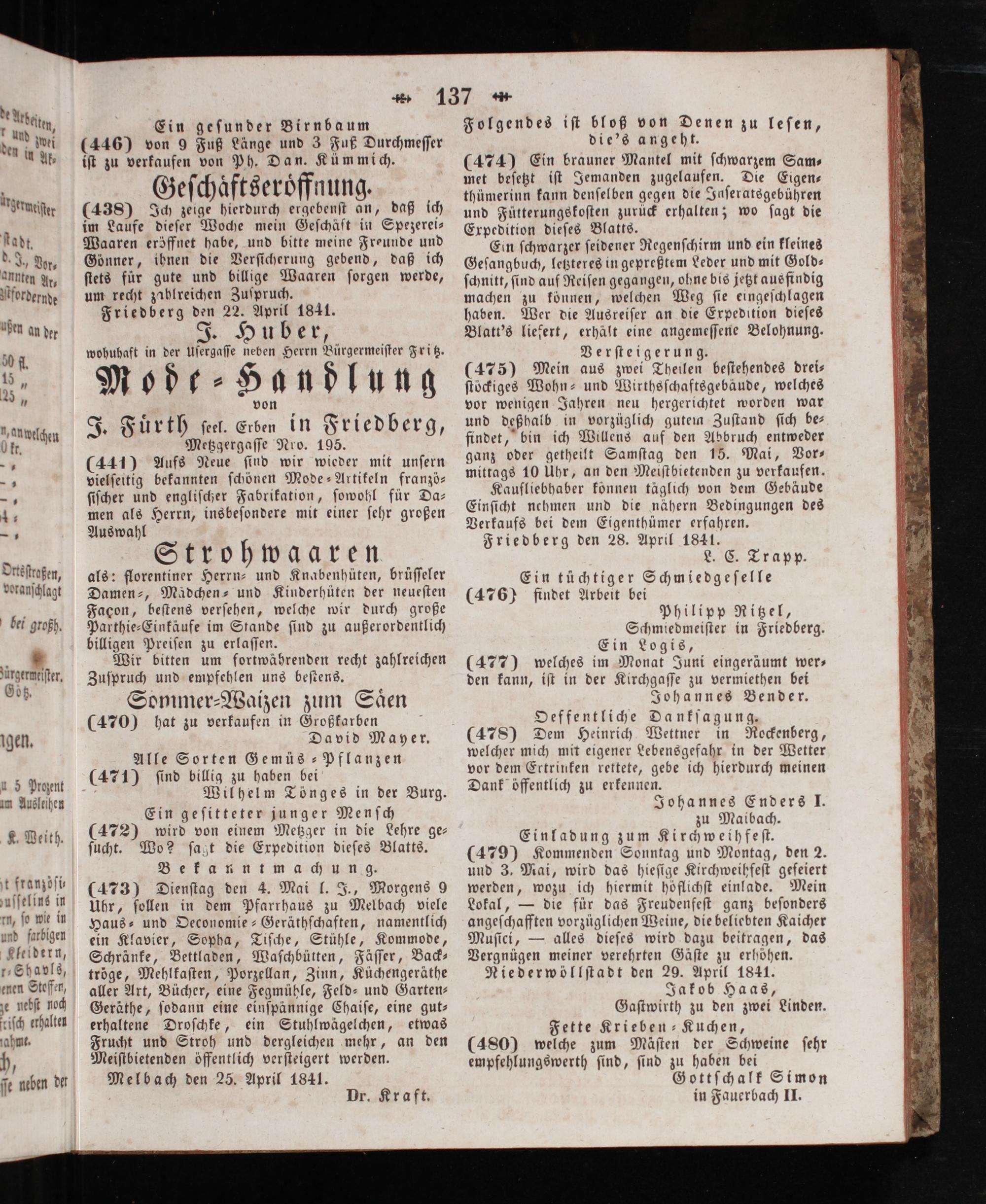 Friedberg den 28. April 1841. L. C. Trapp. Ein tüchtiger Schmiedgeſelle (476) findet Arbeit bei Philipp Ritzel, Schmiedmeiſter in Friedberg. Ein Logis, (477) welches im Monat Juni eingeräumt wer— den kann, iſt in der Kirchgaſſe zu vermiethen bei Johannes Bender. Oeffentliche Dankſagung. (478) Dem Heinrich Wettner in Rockenberg, welcher mich mit eigener Lebensgefahr in der Wetter vor dem Ertrinken rettete, gebe ich hierdurch meinen Dank öffentlich zu erkennen. Johannes Enders J. zu Maibach. Einladung zum Kirchweihfeſt. (479) Kommenden Sonntag und Montag, den 2. und 3. Mai, wird das hieſige Kirchweihfeſt gefeiert werden, wozu ich hiermit höflichſt einlade. Mein Lokal,— die fur das Freudenfeſt ganz beſonders angeſchafften vorzüglichen Weine, die beliebten Kaicher Muſici,— alles dieſes wird dazu beitragen, das Vergnügen meiner verehrten Gäſte zu erhöhen. Niederwöllſtadt den 29. April 1841. Jakob Haas, Gaſtwirth zu den zwei Linden. Fette Krieben-Kuchen, (480) welche zum Mäſten der Schweine ſehr empfehlungswerth ſind, ſind zu haben bei Gottſchalk Simon in Fauerbach II.