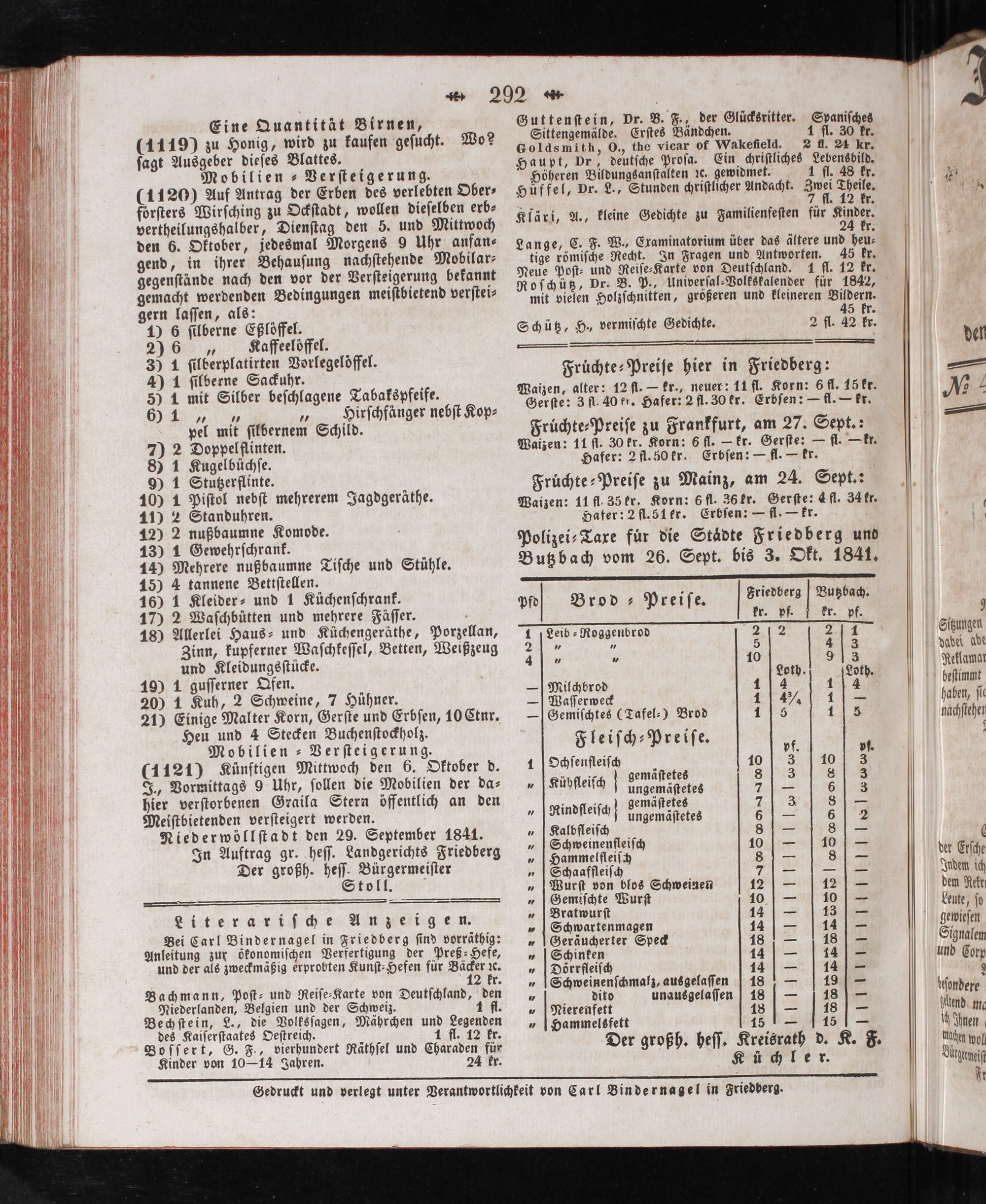 Niederwöllſtadt den 29. September 1841. In Auftrag gr. heſſ. Landgerichts Friedberg Der großh. beſe 5 toll.