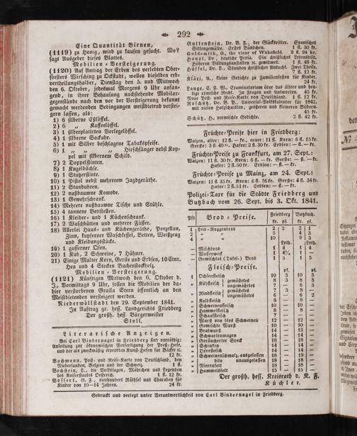 Polizei⸗Taxe für die Staͤdte Friedberg und Butzbach vom 26. Sept. bis 3. Okt. 1841.