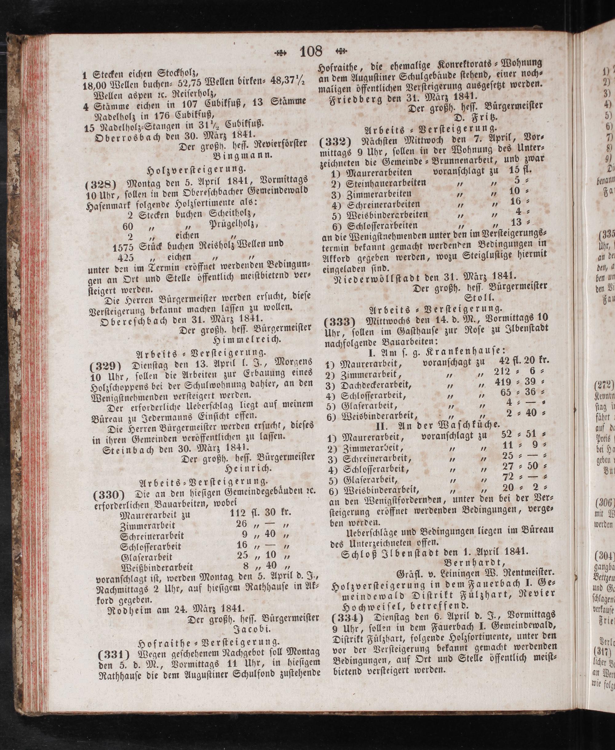 42⁵„ eichen 7 7 unter den im Termin eröffnet werdenden Bedingun⸗ gen an Ort und Stelle oͤffentlich meiſtbietend ver— ſteigert werden. Die Herren Bürgermeiſter werden erſucht, dieſe Verſteigerung bekannt machen laſſen zu wollen. Obereſchbach den 31. März 1841. Der großh. heſſ. Bürgermeiſter Himmelreich. Arbeits-Verſteigerung. (329) Dienſtag den 13. April l. J., Morgens 10 Uhr, ſollen die Arbeiten zur Erbauung eines Holzſchoppens bei der Schulwohnung dahier, an den Wenigſtnehmenden verſteigert werden. Der erforderliche Ueberſchlag liegt auf meinem Büreau zu Jedermanns Einſicht offen. Die Herren Bürgermeiſter werden erſucht, dieſes in ihren Gemeinden veröffentlichen zu laſſen. Steinbach den 30. März 1841. Der großh. heſſ. Bürgermeiſter Heinrich. Arbeits-Verſteigerung. (330) Die an den hieſigen Gemeindegebaͤuden ꝛc. erforderlichen Bauarbeiten, wobei f