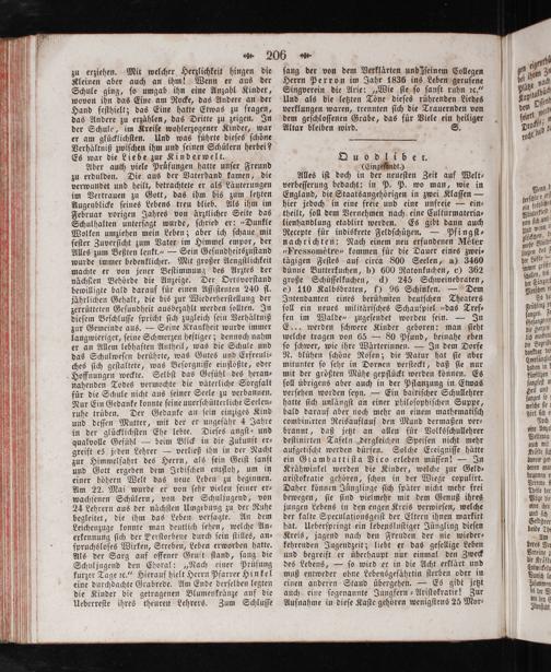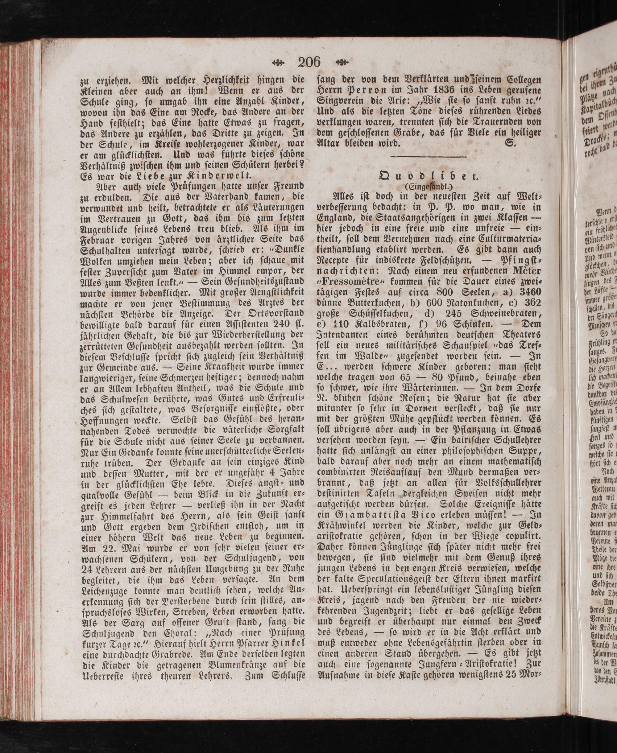 Aber auch viele Pruͤfungen hatte unſer Freund zu erdulden. Die aus der Vaterhand kamen, die verwundet und heilt, betrachtete er als Läuterungen im Vertrauen zu Gott, das ihm bis zum letzten Augenblicke ſeines Lebens treu blieb. Als ihm im Februar vorigen Jahres von ärztlicher Seite das Schulhalten unterſagt wurde, ſchrieb er:„Dunkle Wolken umziehen mein Leben; aber ich ſchaue mit feſter Zuverſicht zum Vater im Himmel empor, der Alles zum Beßten lenkt.“— Sein Geſundheitszuſtand wurde immer bedenklicher. Mit großer Aengſtlichkeit machte er von jener Beſtimmung des Arztes der nächſten Behörde die Anzeige. Der Ortsvorſtand bewilligte bald darauf für einen Aſſiſtenten 240 fl. jährlichen Gehalt, die bis zur Wiederherſtellung der zerrütteten Geſundheit ausbezahlt werden ſollten. In dieſem Beſchluſſe ſpricht ſich zugleich ſein Verhältniß zur Gemeinde aus.— Seine Krankheit wurde immer langwieriger, ſeine Schmerzen heftiger; dennoch nahm er an Allem lebhaften Antheil, was die Schule und das Schulweſen berührte, was Gutes und Exfreuli— ches ſich geſtaltete, was Beſorgniſſe einfloßte, oder Hoffnungen weckte. Selbſt das Gefühl des heran⸗ nahenden Todes vermochte die väterliche Sorgfalt für die Schule nicht aus ſeiner Seele zu verbannen. Nur Ein Gedanke konnte ſeine unerſchütterliche Seelen— ruhe trüben. Der Gedanke an ſein einziges Kind und deſſen Mutter, mit der er ungefähr 4 Jahre in der glücklichſten Ehe lebte. Dieſes angſt⸗ und qualvolle Gefühl— beim Blick in die Zukunft er⸗ greift es jeden Lehrer— verließ ihn in der Nacht zur Himmelfahrt des Herrn, als ſein Geiſt ſanft und Gott ergeben dem Irdiſchen entfloh, um in einer höhern Welt das neue Leben zu beginnen. Am 22. Mai wurde er von ſehr vielen ſeiner er— wachſenen Schülern, von der Schuljugend, von 24 Lehrern aus der nächſten Umgebung zu der Ruhe begleitet, die ihm das Leben verſagte. An dem Leichenzuge konnte man deutlich ſehen, welche An⸗ erkennung ſich der Verſtorbene durch ſein ſtilles, an⸗ ſpruchsloſes Wirken, Streben, Leben erworben hatte. Als der Sarg auf offener Gruft ſtand, ſang die Schuljugend den Choral:„Nach einer Prufung kurzer Tage ꝛc.“ Hierauf hielt Herrn Pfarrer Hinkel eine durchdachte Grabrede. Am Ende derſelben legten die Kinder die getragenen Blumenkränze anf die Ueberreſte ihres theuren Lehrers. Zum Schluſſe