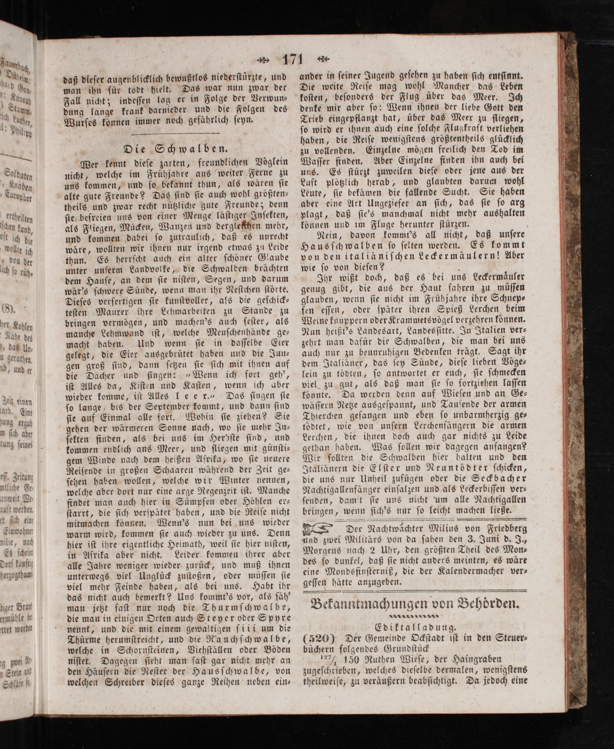 der Nachtwächter Milius von Friedberg und zwei Militärs von da ſahen den 3. Juni d. J., Morgens nach 2 Uhr, den größten Theil des Mon— des ſo dunkel, daß ſie nicht anders meinten, es wäre eine Mondsfinſterniß, die der Kalendermacher ver— geſſen hätte anzugeben. Bekanntmachungen von Behoͤrden. t NN Ediktalladung. (520) Der Gemeinde Ockſtadt iſt in den Steuer⸗ büchern folgendes Grundſtück 12 150 Ruthen Wieſe, der Haingraben