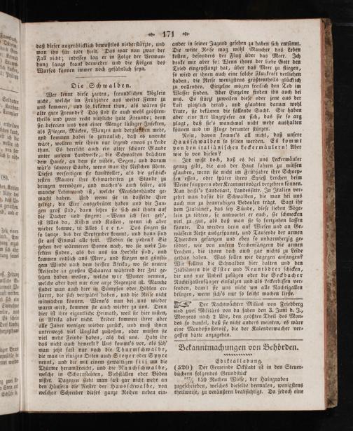 wäre, wollten wir ihnen nur irgend etwas zu Leide thun. Es herrſcht auch ein alter ſchöner Glaube unter unſerm Landvolke, die Schwalben brächten dem Hauſe, an dem ſie niſten, Segen, und darum wär's ſchwere Sünde, wenn man ihr Neſtchen ſtörte. Dieſes verſertigen ſie kunſtvoller, als die geſchick— teſten Maurer ihre Lehmarbeiten zu Stande zu bringen vermögen, und machen's auch feſter, als manche Lehmwand iſt, welche Menſchenhände ge— macht haben. Und wenn ſie in daſſelbe Eier gelegt, die Eier ausgebrütet haben und die Jun— gen groß ſind, dann ſetzen ſie ſich mit ihnen auf die Dächer und ſingen:„Wenn ich fort geh', iſt Alles da, Kiſten und Kaſten, wenn ich aber wieder komme, iſt Alles leer.“ Das ſingen ſie ſo lange, bis der September kommt, und dann ſind ſie auf Einmal alle fort. Wohin ſie ziehen? Sie gehen der wärmeren Sonne nach, wo ſie mehr Ju⸗ ſekten finden, als bei uns im Heröſte ſind, und kommen endlich ans Meer, und fliegen mit günſti— gem Winde nach dem heißen Afrika, wo ſie neuere Reiſende in großen Schaaren während der Zeit ge— ſehen haben wollen, welche wir Winter nennen, welche aber dort nur eine arge Regenzeit iſt. Manche findet man auch hier in Sümpfen oder Höhlen er— ſtarrt, die ſich verſpätet haben, und die Reiſe nicht mitmachen können. Wenn's nun bei uns wieder warm wird, kommen ſie auch wieder zu uns. Denn hier iſt ihre eigentliche Heimath, weil ſie hier niſten, in Afrika aber nicht. Leider kommen ihrer aber alle Jahre weniger wieder zurück, und muß ihnen unterwegs viel Unglück zuſtoßen, oder müſſen ſie viel mehr Feinde haben, als bei uns. Habt ihr das nicht auch bemerkt? Uns kommt's vor, als ſäh' man jetzt faſt nur noch die Thurmſchwalbe, die man in einigen Orten auch Steyer oder Spyre nennt, und die mit einem gewaltigen ſii i um die Thürme herumſtreicht, und die Rauchſchwalbe, welche in Schornſteinen, Viehſtällen oder Böden niſtet. Dagegen ſieht man faſt gar nicht mehr an den Häuſern die Neſter der Hausſchwalbe, von welchen Schreiber dieſes ganze Reihen neben ein—
