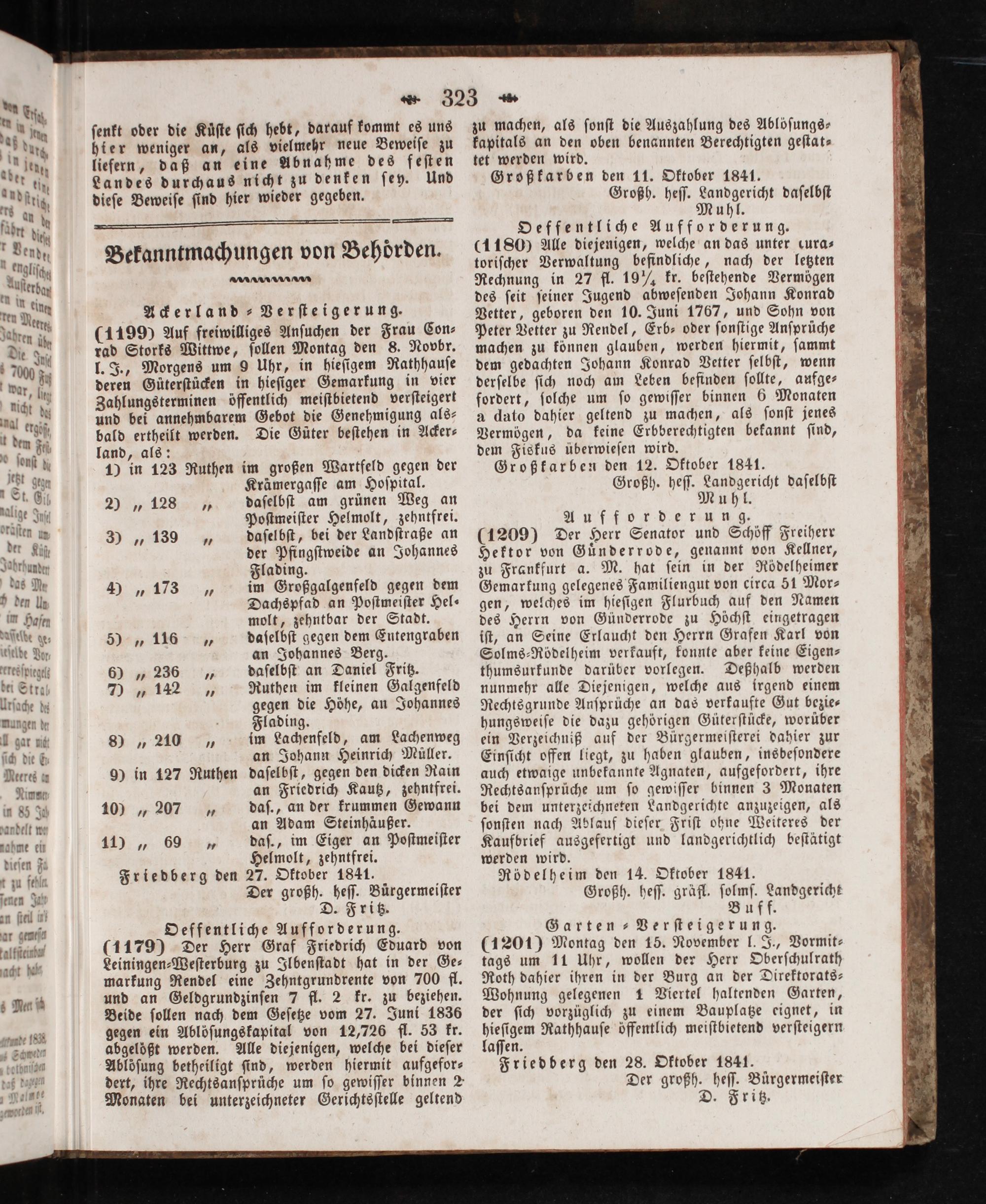Friedberg den 27. Oktober 1841. Der großh. heſſ. Bürgermeiſter D. Fritz. Deffentliche Aufforderung.