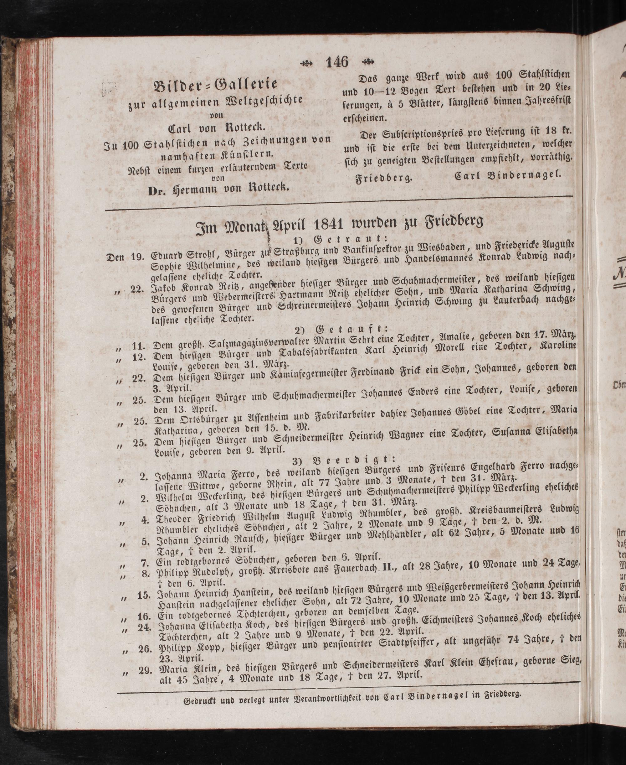 Gedruckt und verlegt unter Verantwortlichkeit von Carl Bindernagel in Friedberg.