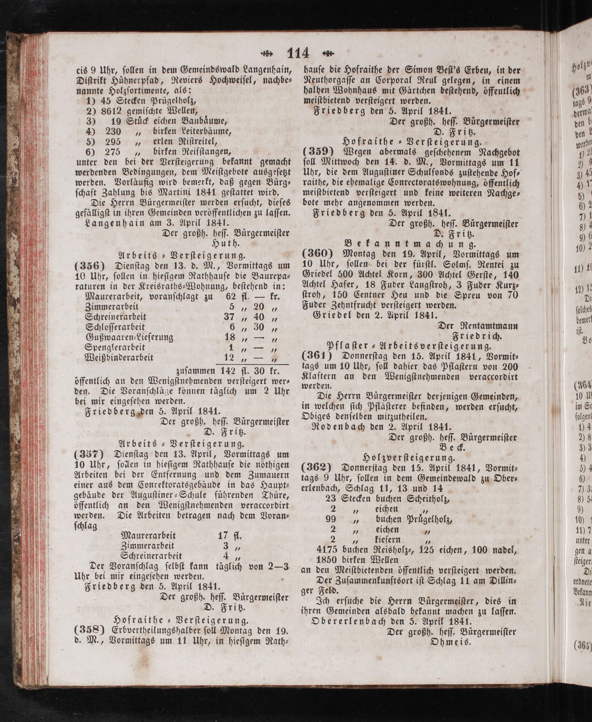raithe, die ehemalige Conrectoratswohnung, öffentlich meiſtbietend verſteigert und keine weiteren Nachge⸗ bote mehr angenommen werden. Friedberg den 5. April 1841. Der großh. heſſ. Bürgermeiſter D. Fritz. Bekanntmachung. (360) Montag den 19. April, Vormittags um 10 Uhr, ſollen bei der fürſtl. Solmſ. Rentei zu Griedel 500 Achtel Korn, 300 Achtel Gerſte, 140 Achtel Hafer, 18 Fuder Langſtroh, 3 Fuder Kurz⸗ ſtroh, 150 Centner Heu und die Spreu von 70 Fuder Zehntfrucht verſteigert werden. Griedel den 2. April 1841. Der Rentamtmann Friedrich. Pflaſter-Arbeitsverſteigerung. (361) Donnerſtag den 15. April 1841, Vormit⸗ tags um 10 Uhr, ſoll dahier das Pflaſtern von 200 Klaftern an den Wenigſtnehmenden veraccordirt werden.