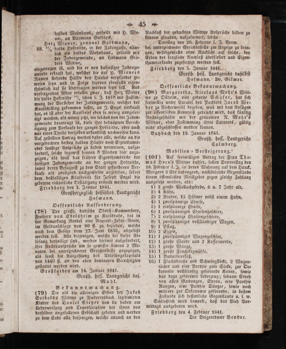 Schließlich wird bemerkt, daß das Vieh Vor— mittags ausgeboten wird. Friedberg den 4. Februar 1841. Der Beigeordnete Bender.