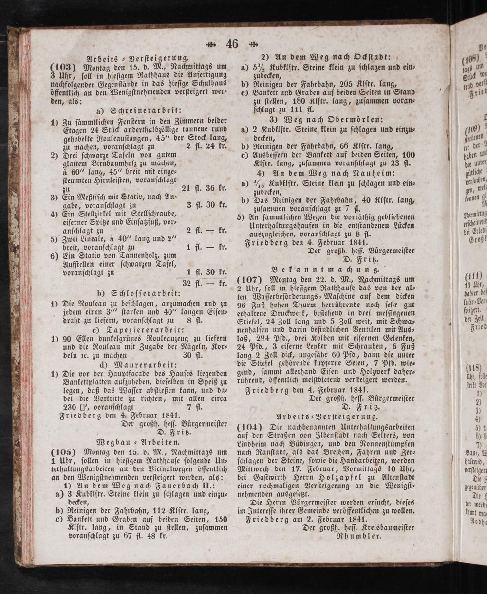 Friedberg den 4. Februar 1841. Der großh. heſſ. Buͤrgermeiſter D. Fritz. Bekanntmachung.