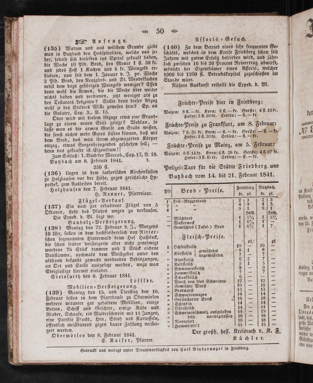 Polizei⸗Taxe fur die Staͤdte Friedberg. und Butzbach vom 14. bis 21. Februar 1841.