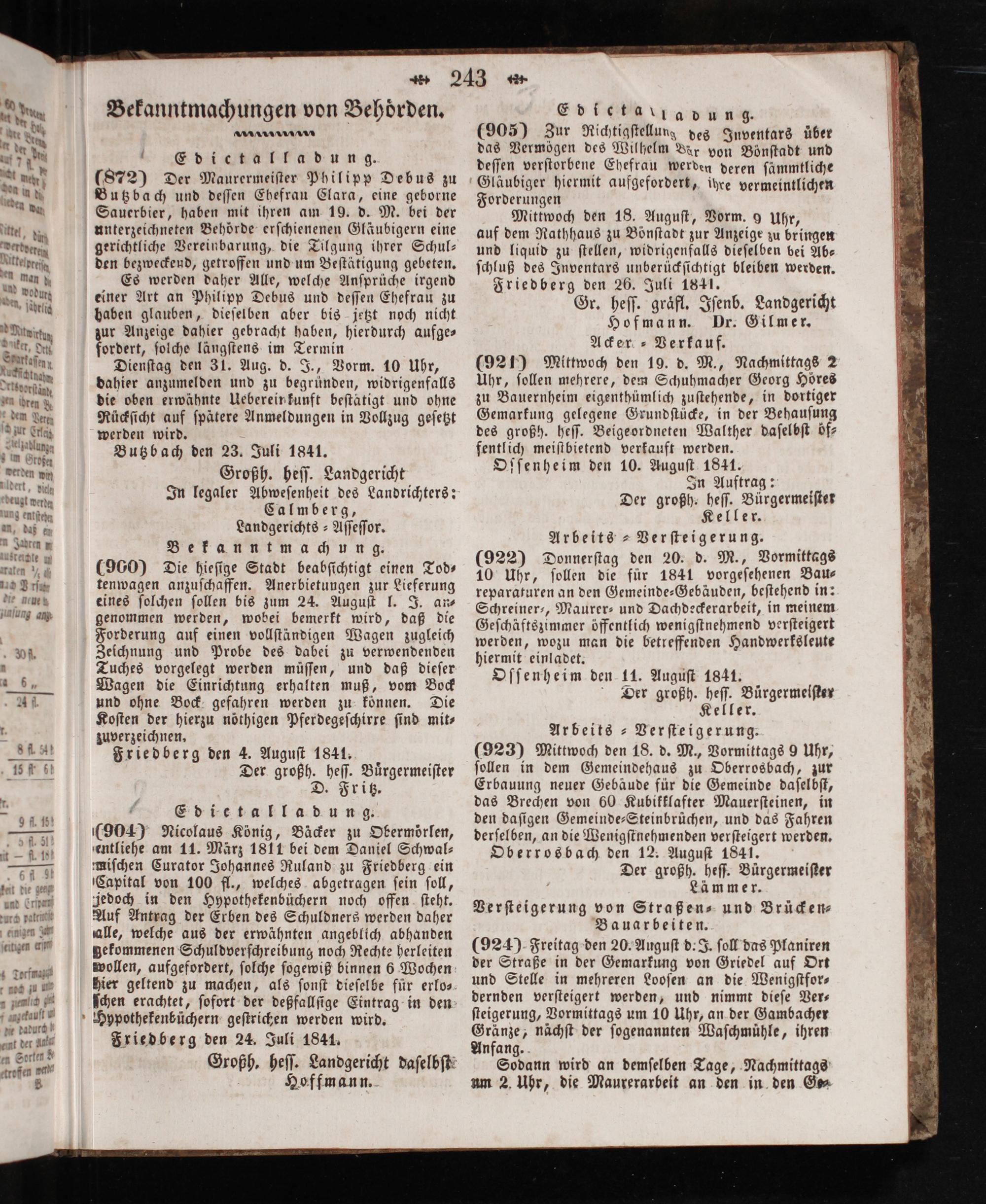 (905) Zur Richtigſtellung des Juventars über das Vermögen des Wilhelm Bar von Böͤnſtadt und deſſen verſtorbene Ehefrau werden deren ſämmtliche Gläubiger hiermit aufgefordert, ihre vermeintlichen Forderungen Mittwoch den 18. Auguſt, Vorm. 9 Uhr, auf dem Rathhaus zu Bönſtadt zur Anzeige zu bringen und liquid zu ſtellen, widrigenfalls dieſelben bei Ab— ſchluß des Inventars unberückſichtigt bleiben werden. Friedberg den 26. Juli 1841. Gr. heſſ. graͤfl. Iſenb. Landgericht Hofmann. Dr. Gilmer. Acker Verkauf. (921) Mittwoch den 19. d. M., Nachmittags 2 Uhr, ſollen mehrere, dem Schuhmacher Georg Höres zu Bauernheim eigenthümlich zuſtehende, in dortiger Gemarkung gelegene Grundſtüͤcke, in der Behauſung des großh. heſſ. Beigeordneten Walther daſelbſt öf—⸗ fentlich meiſtbietend verkauft werden. Oſſenheim den 10. Auguſt 1841. In Auftrag: Der großh. heſſ. Bürgermeiſter Keller. Arbeits-Verſteigerung. (922) Donnerſtag den 20. d. M., Vormittags 10 Uhr, ſollen die für 1841 vorgeſehenen Bau⸗ reparaturen an den Gemeinde-Gebäuden, beſtehend in: Schreiner-, Maurer- und Dachdeckerarbeit, in meinem Geſchäftszimmer öffentlich wenigſtnehmend verſteigert werden, wozu man die betreffenden Handwerksleute hiermit einladet. Oſſenheim den 11. Auguſt 1841. Der großh. heſſ. Buͤrgermeiſter Keller. Arbeits-Verſteigerung. (923) Mittwoch den 18. d. M., Vormittags 9 Uhr, ſollen in dem Gemeindehaus zu Oberrosbach, zur Erbauung neuer Gebäude für die Gemeinde daſelbſt, das Brechen von 60 Kubikklafter Mauerſteinen, in den daſigen Gemeinde-Steinbrüchen, und das Fahren derſelben, an die Wenigſtnehmenden verſteigert werden. Oberrosbach den 12. Auguſt 1841. Der großh. heſſ. Bürgermeiſter Lämmer. Verſteigerung von Straßen- und Brücken⸗ Bauarbeiten.