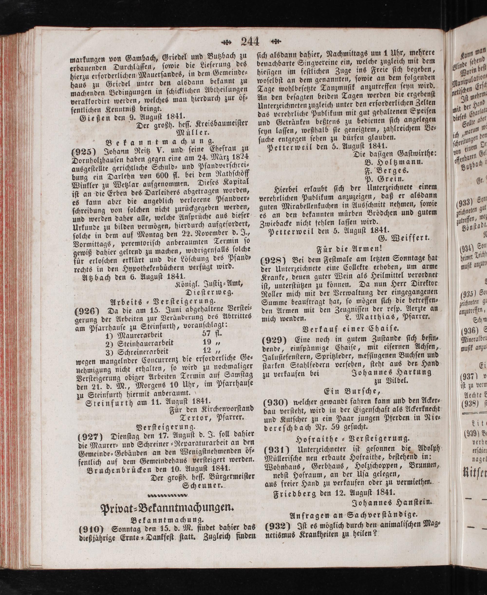 und Kutſcher zu ein Paar jungen Pferden in Nie⸗ dereſchbach Nr. 59 geſucht. Hofraithe-Verſteigerung. (931) unterzeichneter iſt geſonnen die Adolph Mülleriſche neu erbaute Hofraithe, beſtehend in: Wohnhaus, Gerbhaus, Holzſchoppen, Brunnen, nebſt Hofraum, an der Uſa gelegen, aus freier Hand zu verkaufen oder zu vermiethen. Friedberg den 12. Auguſt 1841. Johannes Hanſtein. Anfragen an Sachverſtändige. (932) Iſt es möglich durch den animaliſchen Mag⸗ netismus Krankheiten zu heilen?