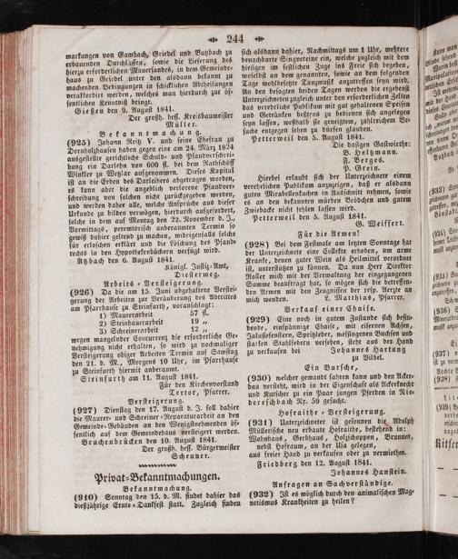 (928) Bei dem Feſtmale am letzten Sonntage hat der Unterzeichnete eine Collekte erhoben, um arme Kranke, denen guter Wein als Heilmittel verordnet iſt, unterſtützen zu können. Da nun Herr Direktor Roller mich mit der Verwaltung der eingegangenen Summe beauftragt hat, ſo mögen ſich die betreffen⸗