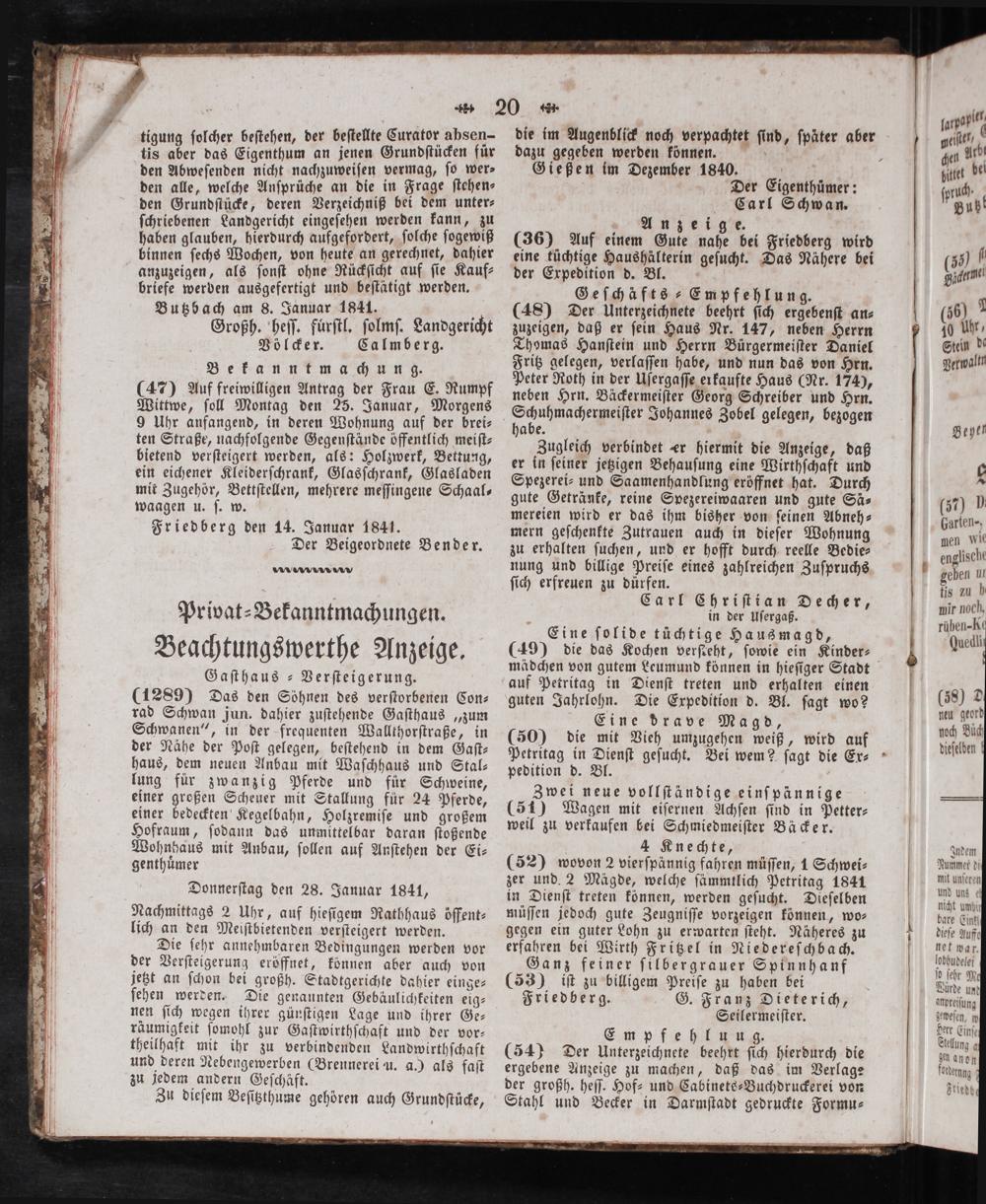 dazu gegeben werden können. Gießen im Dezember 1840. Der Eigenthümer: Carl Schwan. Anzeige. (36) Auf einem Gute nahe bei Friedberg wird eine tüchtige Haushälterin geſucht. Das Nähere bei der Expedition d. Bl. Geſchäfts⸗ Empfehlung. (48) Der Unterzeichnete beehrt ſich ergebenſt an⸗ zuzeigen, daß er ſein Haus Nr. 147, neben Herrn Thomas Hanſtein und Herrn Bürgermeiſter Daniel Fritz gelegen, verlaſſen habe, und nun das von Hrn. Peter Roth in der Uſergaſſe erkaufte Haus(Nr. 174), neben Hru. Bäckermeiſter Georg Schreiber und Hrn. Schuhmachermeiſter Johannes Zobel gelegen, bezogen habe.