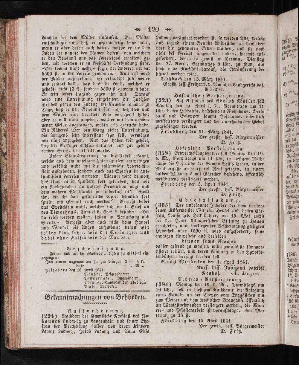 Ludwig veräußert worden iſt, ſo werden Alle, welche aus irgend einem Grunde Anſprüche an denſelben oder die genannten Erben machen, und ſie noch nicht bei Gericht angemeldet haben, hiermit auf— gefordert, dieſes ſo gewiß im Termin, Dienſtag den 27. April, Vormittags 8 Uhr, zu thun, als ſonſt ohne Rüͤckſicht darauf, die Veräußerung be⸗ ſtätigt werden wird. g Butzbach den 13. März 1841. Großh. heſſ. Freiherrl. v. Löw'ſches Landgericht daſ. 5 Völcker. Hofraithe-Verſteigerung. (323) Auf Anſuchen des Adolph Müller ſoll Montag den 19. April l. J., Vormittags um 11 Uhr, deſſen Hofraithe, beſtehend in Wohnhaus, Gerb— haus und Schoppen ſammt Hofräume, öffentlich meiſtbietend verſteigert und bei annehmbarem Gebot zugeſchlagen werden. Friedberg den 31. März 1841. Der großh. heſſ. Bürgermeiſter Di. Fritz. Hofraithe-Verſteigerung. (358) Erbvertheilungshalber ſoll Montag den 19. d. M., Vormittags um 11 Uhr, in hieſigem Rath⸗ hauſe die Hofraithe der Simon Beſt's Erben, in der Neuthorgaſſe an Corporal Reul gelegen, in einem halben Wohnhaus mit Gärtchen beſtehend, öffentlich meiſtbietend verſteigert werden. Friedberg den 5. April 1841. Der großh. heſſ. Buͤrgermeiſter D. Fritz. Edita lad um g. (365) Der unbekannte Inhaber der vom verſtor⸗ benen Küfermeiſter Wilhelm Henkel und deſſen Ehe⸗ frau, Louiſe geb. Heck dahier, am 15. Mai 1829 bei der Henri Blachier'ſchen Stiftung zu Hanau errichteten, nach vorliegender Beſcheinigung getilgten Hypothek über 1500 fl. wird aufgefordert, ſeine etwaigen Anſpruͤche aus derſelben binnen ſechs Wochen dahier geltend zu machen, widrigenfalls ſie fuͤr mor— tificirt erklärt, und deren Löſchung in den Hypothe⸗ kenbüchern verfügt werden ſoll. Verfügt Windecken den 1. April 1841. Kurf. heſſ. Juſtizamt daſelbſt Neuhof. dt. Degen. 5 Arbeits ⸗Verſteigerung. (384) Montag den 19. d. M., Vormittags um 10 Uhr, ſoll in hieſigem Rathhauſe die Anlegung eines Kanals an der Treppe vom Enggäßchen bis zum Weiher und vom Kochiſchen Brauhauſe öffentlich an Wenigſtnehmenden verſteigert werden; die Mau⸗ rer- und Pflaſterarbeit iſt voranſchlagt, ohne Ma⸗ terial, zu 33 fl. Friedberg den 15. April 1841. 5 Der großh. heſſ. Buͤrgermeiſter D. Fritz.