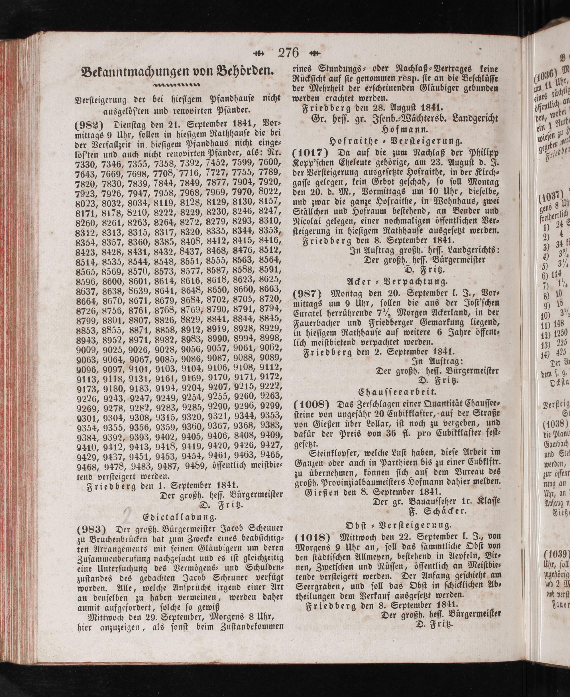 Gießen den 8. September 1841. Der gr. Bauaufſeher 11. Klaſſe F. Schaͤcker. Obſt-Verſteigerung. (1018) Mittwoch den 22. September J. J., von Morgens 9 Uhr an, ſoll das ſämmtliche Obſt von den ſtädtiſchen Allmeyen, beſtehend in Aepfeln, Bir⸗ nen, Zwetſchen und Nüſſen, öffentlich an Meiſtbie⸗ tende verſteigert werden. Der Anfang geſchieht am Seergraben, und ſoll das Obſt in ſchicklichen Ab⸗ theilungen dem Verkauf ausgeſetzt werden. 5 Friedberg den 8. September 1841. Der großh. heſſ. Bürgermeiſter D. Fritz.