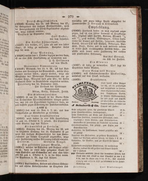 Eine Wohnung, (1058) welche den 1. October bezogen werden kann, iſt an eine ſtille Haushaltung zu vermiethen von J. H. Hoffmann auf dem Markt. Wetterauer Bienenverein. (1059) Mittwoch, den 22. d. M., ſoll das Aus⸗ treiben und Vereinigen der Bienenſtöcke, welche über— wintert werden ſollen, gezeigt werden, wozu alle Mitglieder des Wetterauer Bienenvereins am ge— dachten Tage, Morgens halb zehn Uhr, bei Herrn Gaſtwirth Stier in Reichelsheim eingeladen werden.
