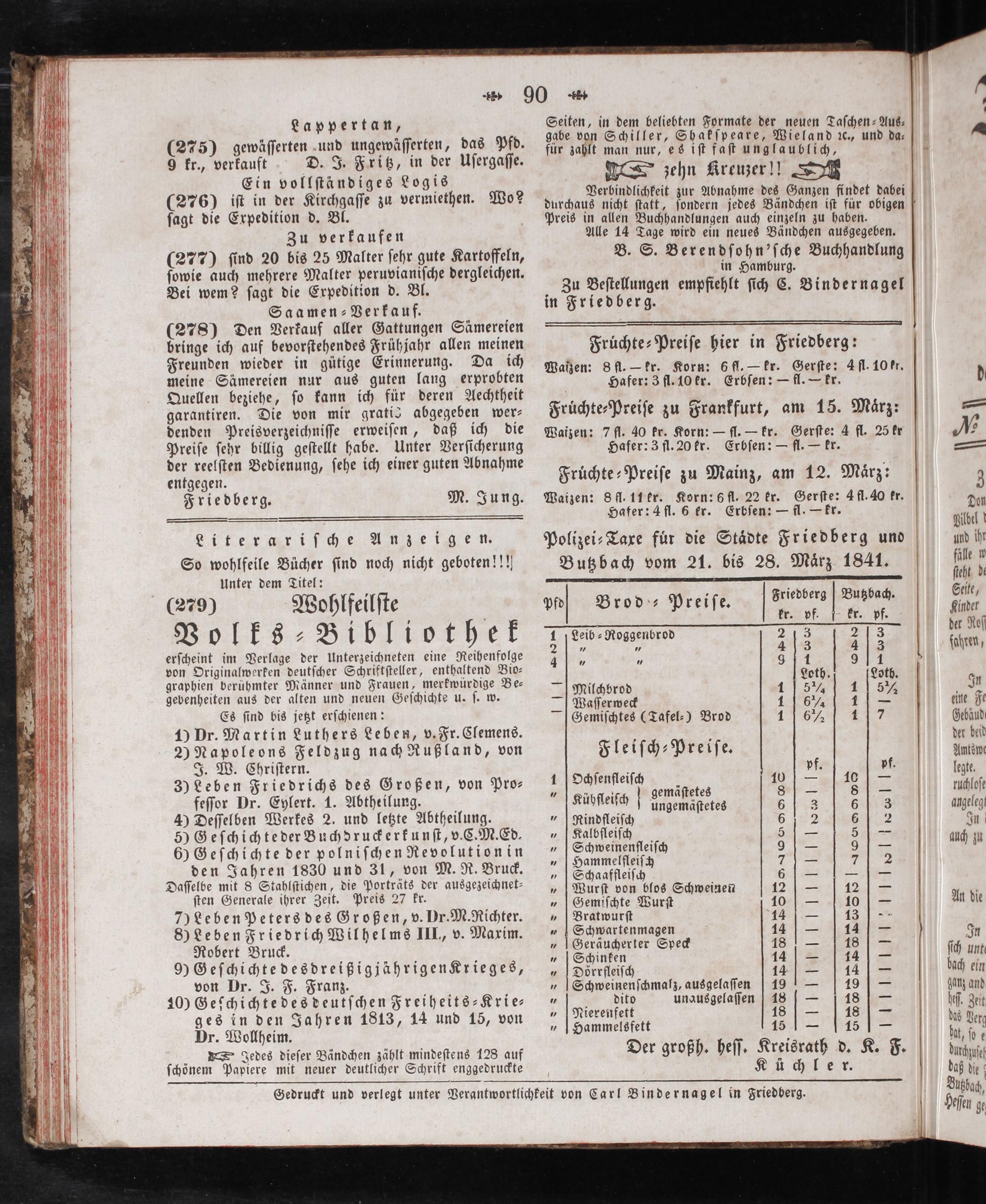 Gedruckt und verlegt unter Verantwortlichkeit von Carl Bindernagel in Friedberg.
