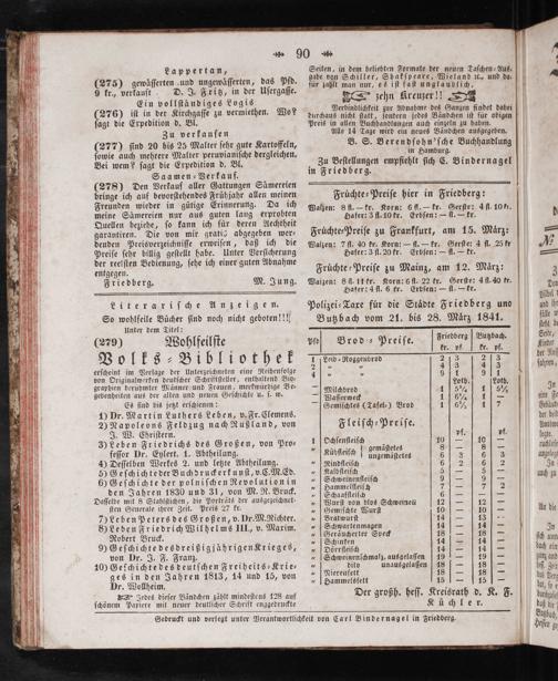 Polizei-Taxe fuͤr die Staͤdte Friedberg und Butzbach vom 21. bis 28. Maͤrz 1841.
