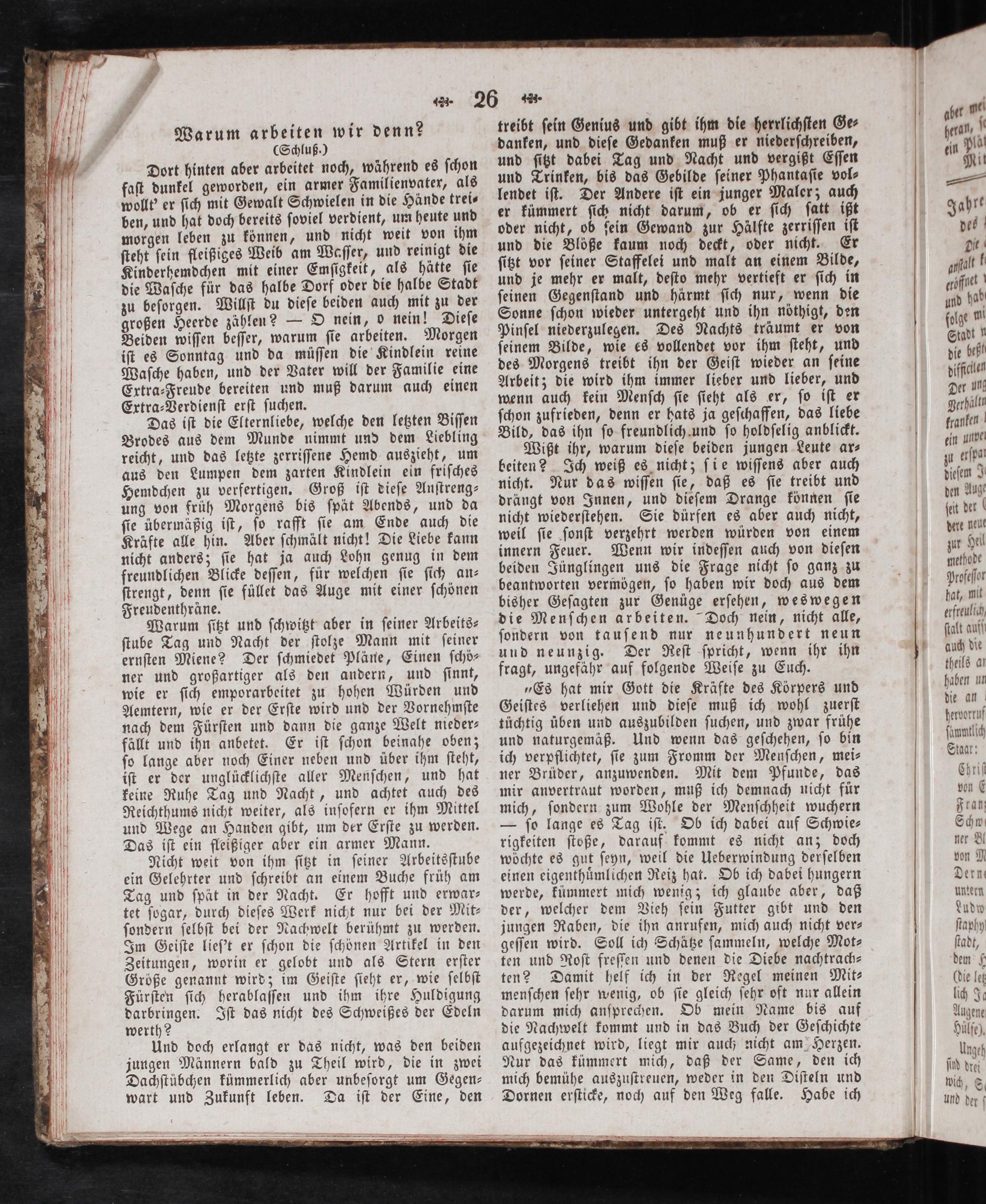 „Es hat mir Gott die Kräfte des Körpers und Geiſtes verliehen und dieſe muß ich wohl zuerſt tüchtig üben und auszubilden ſuchen, und zwar frühe und naturgemäß. Und wenn das geſchehen, ſo bin ich verpflichtet, ſie zum Fromm der Menſchen, mei— ner Brüder, anzuwenden. Mit dem Pfunde, das mir anvertraut worden, muß ich demnach nicht für mich, ſondern zum Wohle der Menſchheit wuchern — ſo lange es Tag iſt. Ob ich dabei auf Schwie— rigkeiten ſtoße, darauf kommt es nicht an; doch woͤchte es gut ſeyn, weil die Ueberwindung derſelben einen eigenthuͤmlichen Reiz hat. Ob ich dabei hungern werde, kümmert mich wenig; ich glaube aber, daß der, welcher dem Vieh ſein Futter gibt und den jungen Raben, die ihn anrufen, mich auch nicht ver⸗ geſſen wird. Soll ich Schätze ſammeln, welche Mot⸗ ten und Roſt freſſen und denen die Diebe nachtrach— ten? Damit helf ich in der Regel meinen Mit— menſchen ſehr wenig, ob ſie gleich ſehr oft nur allein darum mich anſprechen. Ob mein Name bis auf die Nachwelt kommt und in das Buch der Geſchichte aufgezeichnet wird, liegt mir auch nicht am Herzen. eur das kümmert mich, daß der Same, den ich mich bemühe auszuſtreuen, weder in den Diſteln und Dornen erſticke, noch auf den Weg falle. Habe ich