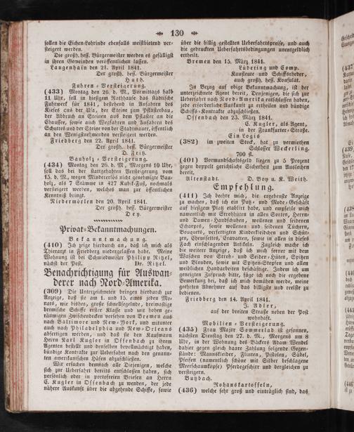 über die billig geſtellten Ueberfahrtspreiſe, und auch die gedruckten Ueberfahrtsbedingungen unentgeldlich ertheilt. Bremen den 15. März 1841. Lüdering und Comp. Kaufleute und Schiffsrheder, auch großh. heſſ. Konſulat. In Bezug auf obige Bekanntmachung, iſt der unterzeichnete Agent bereit, Denjenigen, die ſich zur Ueberſahrt nach Nord-Amerika entſchloſſen haben, jede erforderliche Auskunft zu ertheilen und bündige Schiffs-Kontrakte abzuſchließen. Offenbach den 23. März 1841. C. Kugler, als Agent, in der Frankfurter⸗Straße. Ein Logis im zweiten Stock, hat zu vermiethen Schloſſer Weckerling. 700 fl. (401) Vormundſchaftsgeld liegen zu 5 Prozent gegen doppelt gerichtliche Sicherheit zum Ausleihen