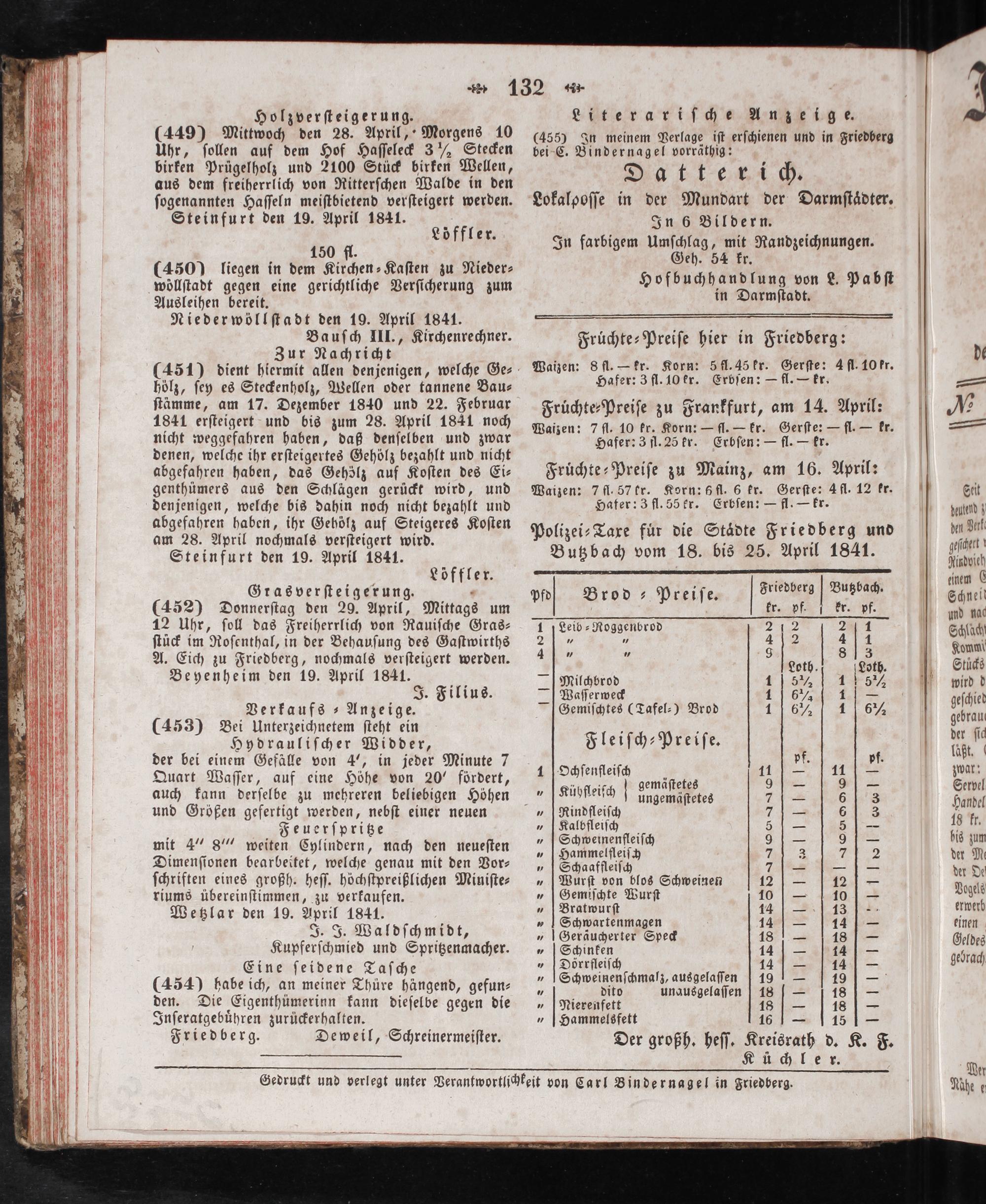 Fruͤchte-Preiſe hier in Friedberg: Waizen: 8 fl.— kr. Korn: 5 fl. 45 kr. Gerſte: 4 fl. 10 fr. Hafer: 3 fl. 10 er. Erbſen:— fl.— kr. Früchte⸗Preiſe zu Frankfurt, am 14. April: Waizen: 7 fl. 10 kr. Korn:— fl.— kr. Gerſte:— fl.— kr. Hafer: 3 fl. 25 kr. Erbſen:— fl.— kr. Fruͤchte-Preiſe zu Mainz, am 16. April: Waizen: 7 fl. 57 kr. Korn: 6 fl. 6 kr. Gerſte: 4fl. 12 kr. Hafer: 3 fl. 55 kr. Erbſen:— fl.— kr. Polizei⸗Taxe fuͤr die Staͤdte Friedberg und Butzbach vom 18. bis 25. April 1841.