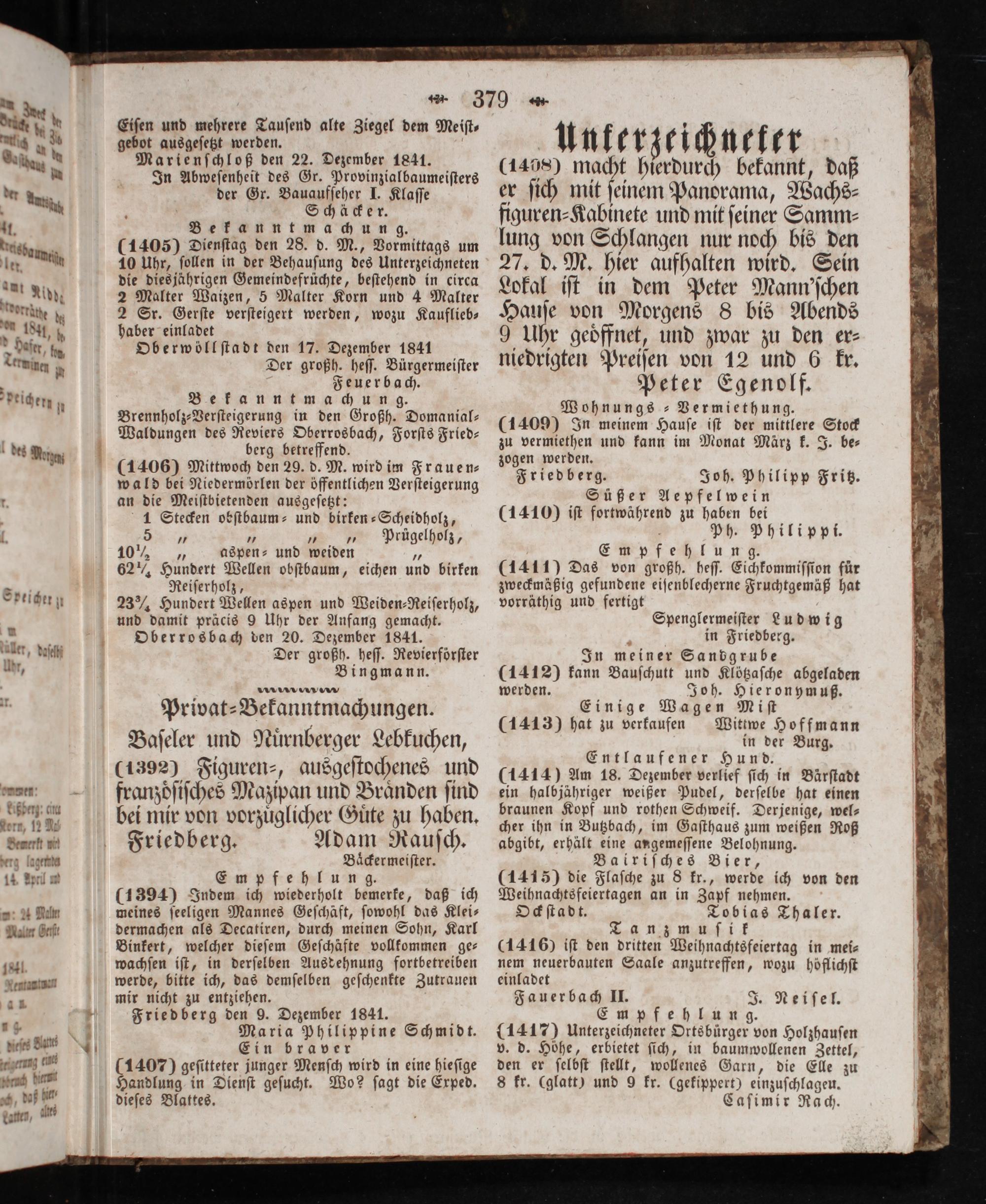 (1400 macht hierdurch bekannt, daß er ſich mit ſeinem Panorama, Wachs⸗ figuren⸗Kabinete und mit ſeiner Samm⸗ lung von Schlangen nur noch bis den 27. d. M. hier aufhalten wird. Sein Lokal iſt in dem Peter Mann'ſchen Hauſe von Morgens 8 bis Abends 9 Uhr geoͤffnet, und zwar zu den er⸗ niedrigten Preiſen von 12 und 6 kr. Peter Egenolf. Wohnungs-Vermiethung. (1409) In meinem Hauſe iſt der mittlere Stock zu vermiethen und kann im Monat März k. J. be⸗ zogen werden. Friedberg. Joh. Philipp Fritz. Süßer Aepfelwein (1410) iſt fortwährend zu haben bei Ph. Philippi. Empfehlung. (1411) Das von großh. heſſ. Eichkommiſſion für zweckmäßig gefundene eiſenblecherne Fruchtgemäß hat vorräthig und fertigt Spenglermeiſter L u d wig g in Friedberg. In meiner Sandgrube (1412) kann Bauſchutt und Klötzaſche abgeladen werden. Joh. Hieronymuß. Einige Wagen Miſt (1413) hat zu verkaufen Wittwe Hoffmann in der Burg. Entlaufener Hund. (1414) Am 18. Dezember verlief ſich in Bärſtadt ein halbjähriger weißer Pudel, derſelbe hat einen braunen Kopf und rothen Schweif. Derjenige, wel⸗ cher ihn in Butzbach, im Gaſthaus zum weißen Roß abgibt, erhält eine angemeſſene Belohnung. Bairiſches Bier, (1415) die Flaſche zu 8 kr., werde ich von den Weihnachtsfeiertagen an in Zapf nehmen. Ockſtadt. Tobias Thaler. Tan zmuſik (1416) iſt den dritten Weihnachtsfeiertag in mei⸗ nem neuerbauten Saale anzutreffen, wozu höflichſt einladet Fauerbach II. J. Neiſel. Empfehlung. (1417) Unterzeichneter Ortsbürger von Holzhauſen v. d. Höhe, erbietet ſich, in baumwollenen Zettel, den er ſelbſt ſtellt, wollenes Garn, die Elle zu 8 kr.(glatt) und 9 kr.(gekippert) einzuſchlageu. Caſimir Rach.