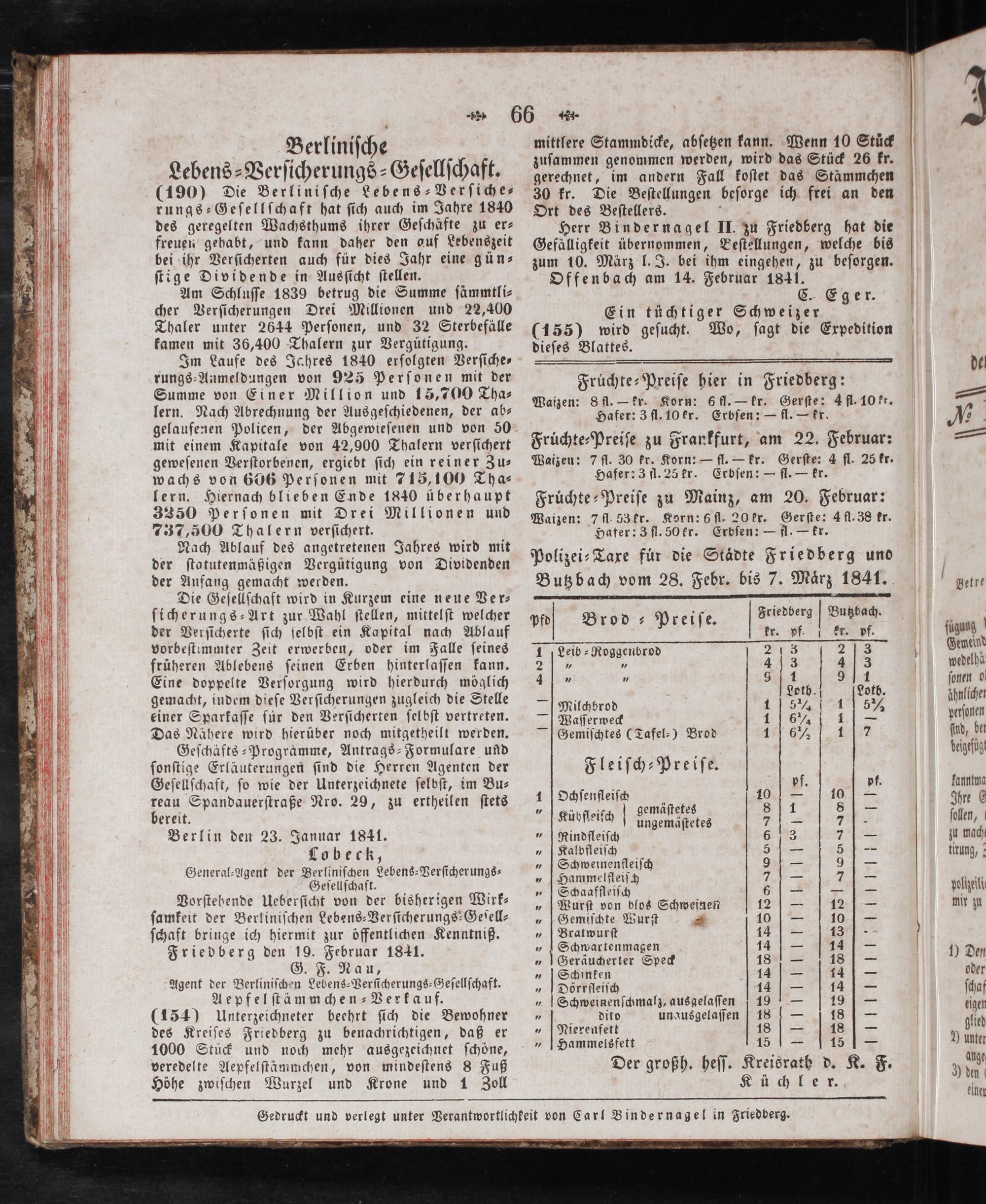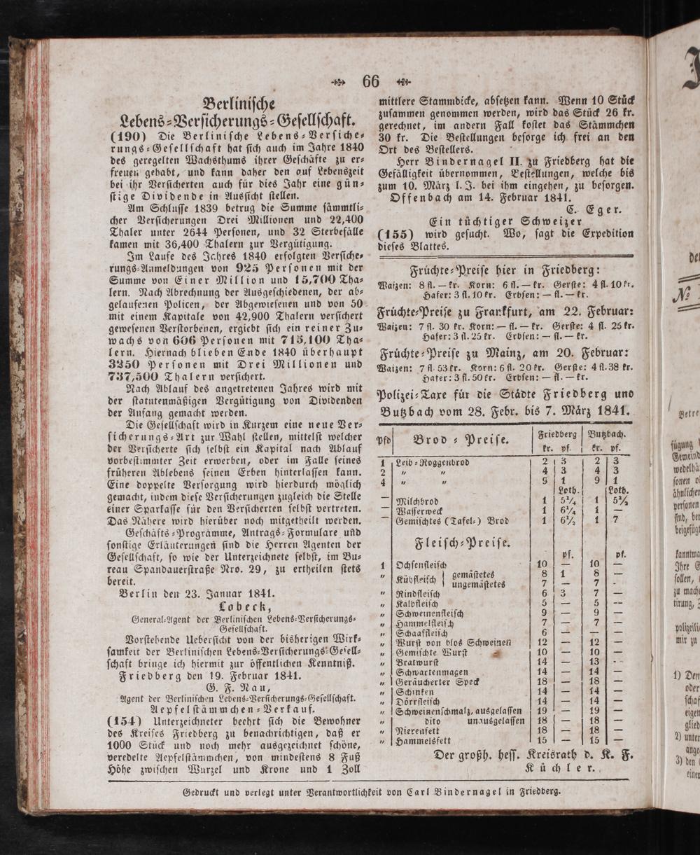 Gedruckt und verlegt unter Verantwortlichkeit von Carl Bindernagel in Friedberg.
