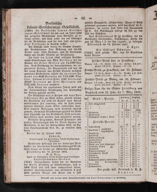 Polizei-Taxe fuͤr die Staͤdte Friedberg und Butzbach vom 28. Febr. bis 7. Maͤrz 1841.