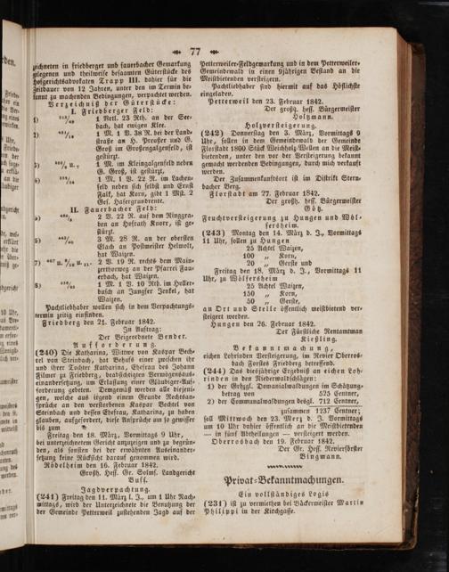 Petterweiler⸗Feldgemarkung und in dem Petterweiler⸗ Gemeindewald in einen 9jährigen Beſtand an die Meiſtbietenden verſteigern. Pachtliebhaber ſind hiermit auf das Höflichſte eingeladen. Petterweil den 23. Februar 1842. Der großg. heſſ. Bürger meiſter Holtzmann. Holzverſteigerung. (242) Donnerſtag den 3. März, Vormittags 9 Uhr, ſollen in dem Gemeindewald der Gemeinde Florſtadt 1800 Stück Weichholz⸗Wellen an die Meiſt⸗ bietenden, unter den vor der Verſteigerung bekannt gemacht werdenden Bedingungen, durch mich verkauft werden. Der Zuſammenkunftsort iſt im Diſtrikt Stern⸗ bacher Berg. Florſtadt am 27. Februar 1842. Der großh. heſſ. Bürgermeiſter Götz. Fruchtverſteigerung zu Hungen und Wöl⸗ fersheim. (243) Montag den 14. März d. J., Vormittags 11 Uhr, ſollen zu Hungen 25 Achtel Waizen, 100„ Korn, 20„ Gerſte und Freitag den 18. März d. J., Uhr, zu Wölfersheim 25 Achtel Waizen, n 50„ Gerſte, an Ort und Stelle öffentlich meiſtbietend ver⸗ ſteigert werden. Hungen den 26. Februar 1842. Der Fürſtliche Rentamtman Kießling. Bekanntmachung, eichen Lohrinden Verſteigerung, im Revier Oberros— bach Forſtes Friedberg betreffend. (244) Das dies jährige Ergebniß an eichen Loh— rinden in den Niederwaldſchlägen: 1) der Grhzgl. Domanialwaldungen im Schaͤtzung⸗ betrag von 525 Centner, 2) der Communalwaldungen desgl. 712 Centner, zuſammen 1237 Centner; ſoll Mittwoch den 23. Merz d. J. Vormittags um 10 Uhr dahier öffentlich an die Meiſtbietenden — in fünf Abtheilungen— verſteigert werden. Oberrosbach den 19. Februar 1842. Der Gr. Heſſ. Revierfoͤrſter Bingmann.