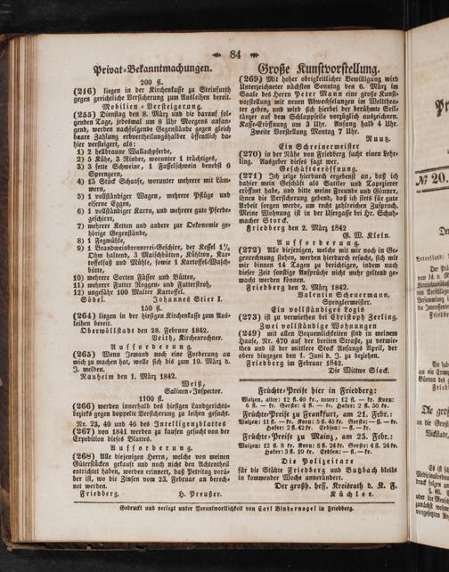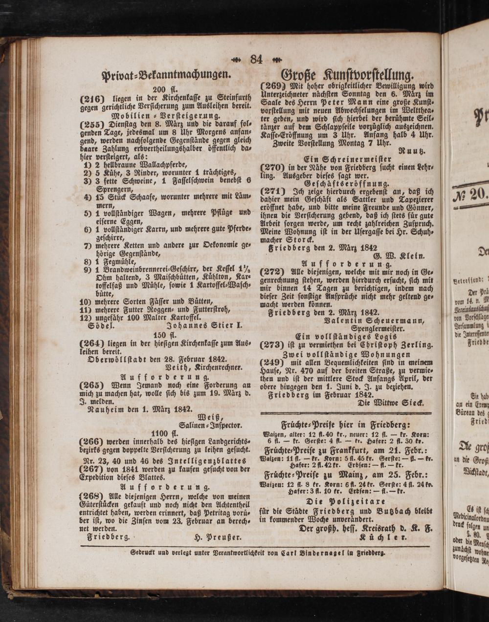 Zweite Vorſtellung Montag 7 Uhr. Ruutz. Ein Schreinermeiſter (270) in der Nähe von Friedberg ſucht einen Lehr⸗ ling. Ausgeber dieſes ſagt wer. Geſchäftseröffnung. (271) Ich zeige hierdurch ergebenſt an, daß ich dahier mein Geſchäft als Sattler und Tapezierer eröffnet habe, und bitte meine Freunde und Gönner, ihnen die Verſicherung gebend, daß ich ſtets für gute Arbeit ſorgen werde, um recht zahlreichen Zuſpruch. Meine Wohnung iſt in der Uſergaſſe bei Hr. Schuh⸗ macher Storck. Friedberg den 2. März 1842 ö G. W. Klein. Aufforderung. (272) Alle diejenigen, welche mit mir noch in Ge⸗ genrechnung ſtehen, werden hierdurch erſucht, ſich mit mir binnen 14 Tagen zu berichtigen, indem nach dieſer Zeit ſonſtige Anſprüche nicht mehr geltend ge⸗ macht werden können. Friedberg den 2. März 1842. Valentin Scheuermann, Spenglermeiſter. Ein vollſtändiges Logis (273) iſt zu vermiethen bei Chriſtoph Zerling.